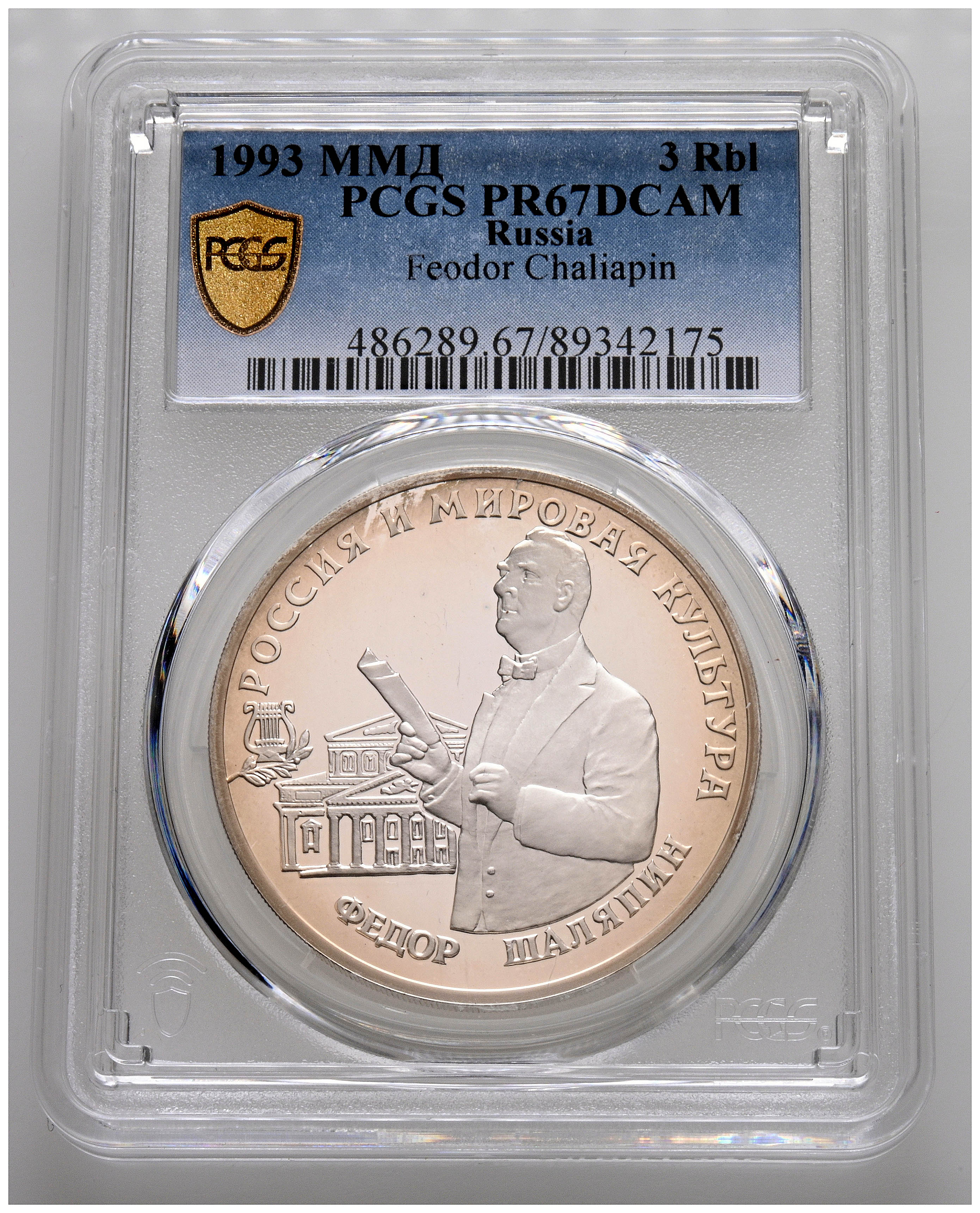 RUSSIA. 3 Rubles. (Ar. 34.88g/39mm)*. 1993. Feodor Shaliapin. (Km#451). Encapsulated by PCGS PR 67DCAM. *Theoretical weight and dimensions.