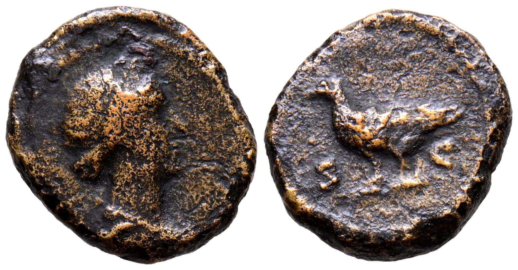 ANONYMOUS (period from Domitian to Antoninus Pius). Quadrant. (Ae. 2.40g/15mm). 81-161 AD Rome. (RIC 24). Obv: Bust of Venus right. Rev: Peacock right between: Uncirculated. Very Fine-.