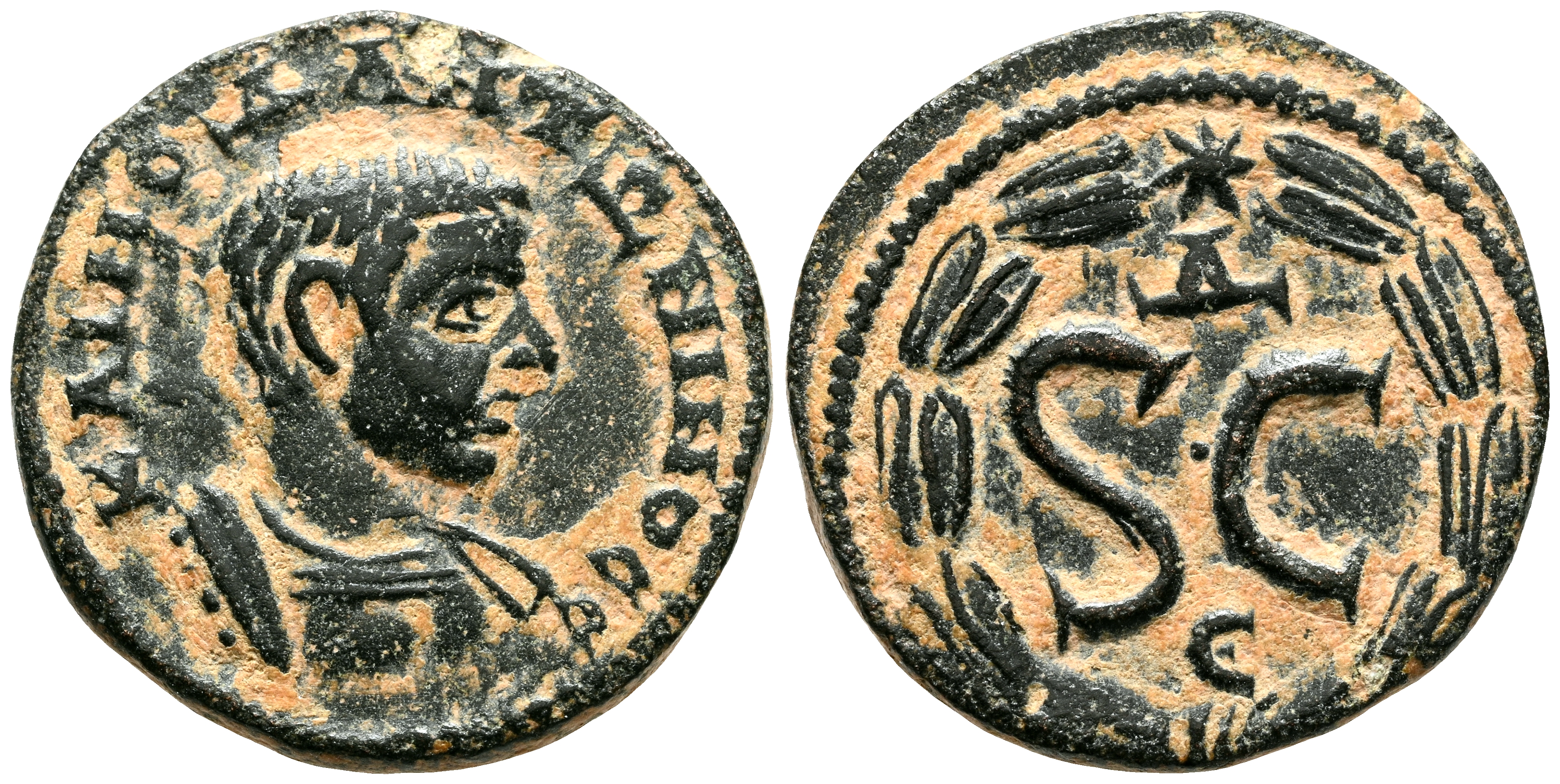 DIADUMENIAN. Ae19. (Ae. 4.90g/19mm). 218 AD Seleucis and Pieria, Antioch. (McAlee 745c). Anv: Bare head of Diadumenian on the right, around legend: KAI MO ΔIA ANTΩNINOC CЄ. Rev: Uncirculated, above Δ and below Є, all within a laurel wreath. Good Very Fine.