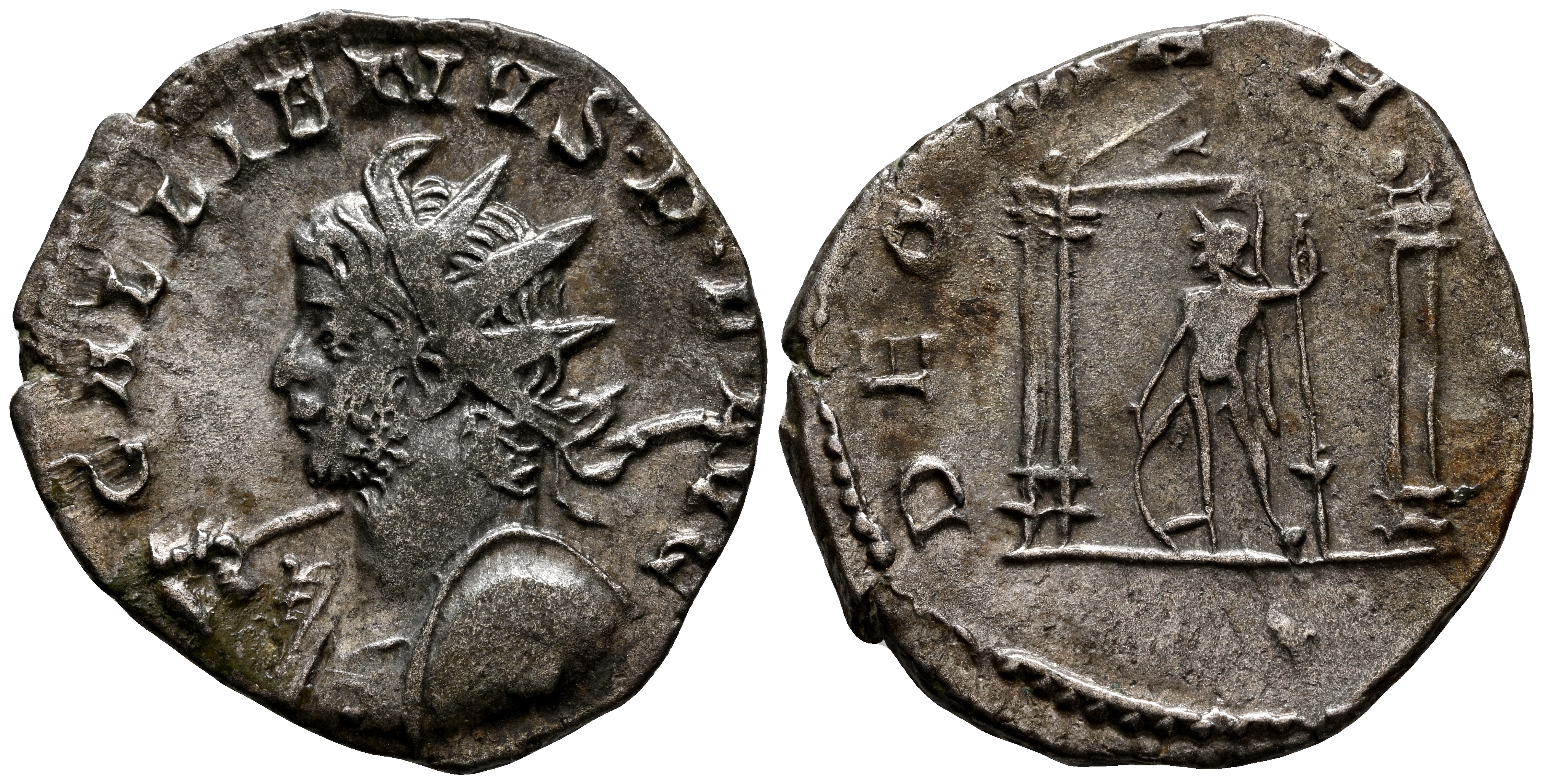 GALLIENUS. Antoninianus. (Ar. 2.84g/21mm). 258-259 AD Cologne. (RIC 10). Obv: Radiate and cuirassed bust of Gallienus facing left, carrying a spear and shield, around the legend: GALLIENVS PF AVG. Rev: Mars standing facing forward, carrying a spear and shield, within a tetrastyle temple, around the legend: DEO MARTI. VF/VF-.