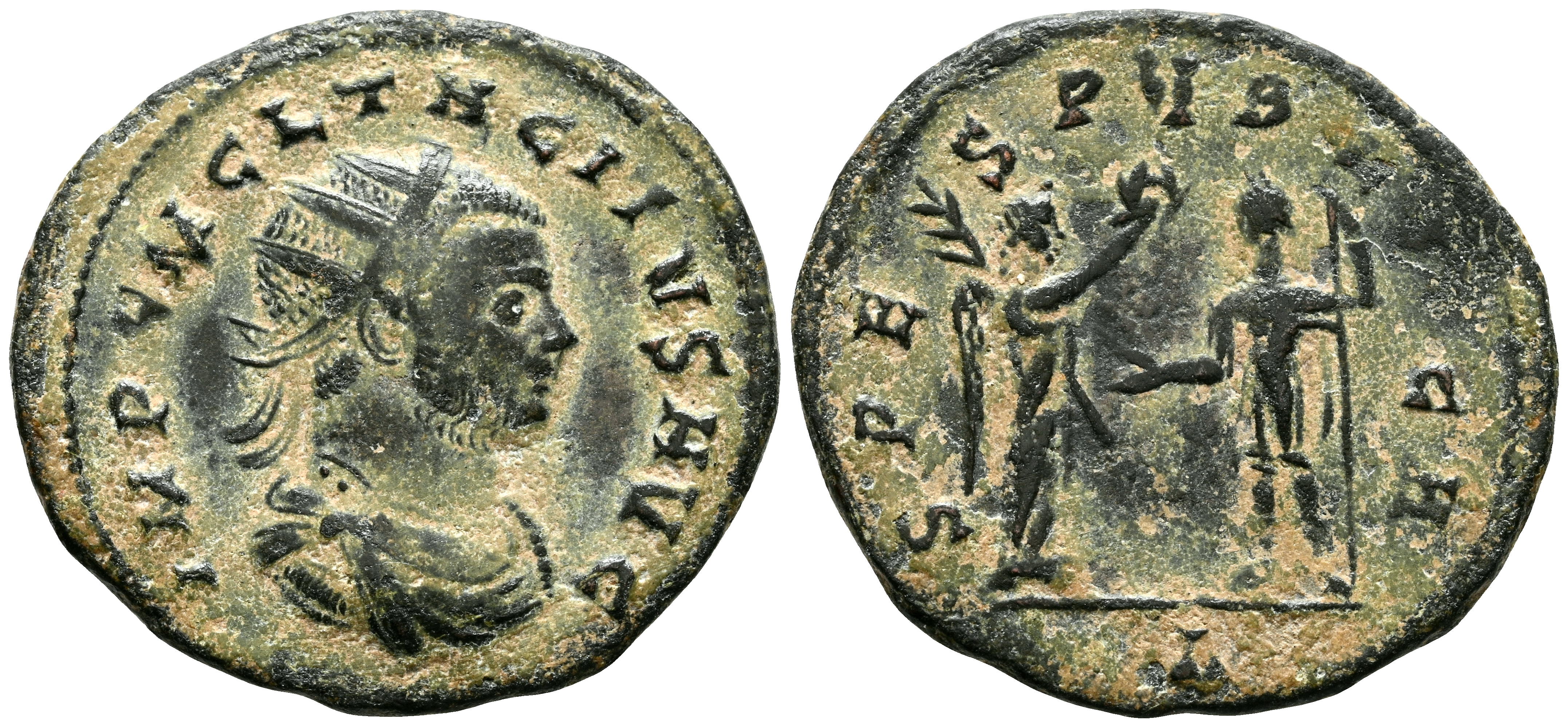 TACITUS. Antoninianus. (Ae. 3.29g/22mm). 275-276. Rome. (RIC 207). Obv: Draped radiate bust of Tacitus facing right, around legend: IMP CM CL TACITVS AVG. Rev: Victory standing right, crowning Tacitus, standing left holding scepter, in exergue: L, around legend: SPES PVBLICA. Very Fine.