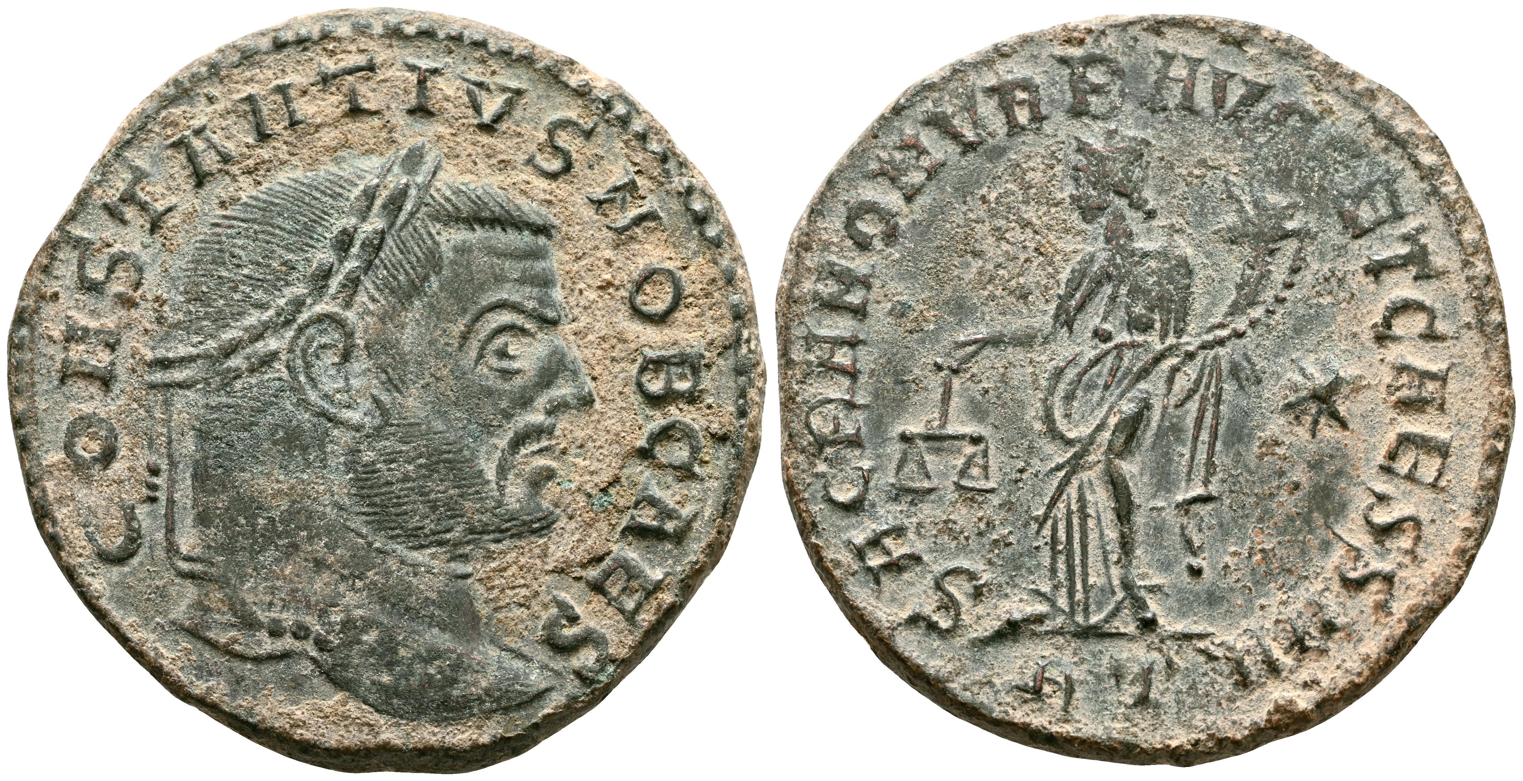 CONSTANTIUS I. Follis. (8.69g/28mm). 302-303 AD Rome. (RIC 10a). Obv: Laureate head of Constantius I facing right, around legend: CONSTANTIVS NOB CAES. Rev: Moneta standing left holding ladder and cornucopia, in field: star, in exergue: RT, around legend: SACRA MON VRB AVGG ET CAESS NN. Very Fine.