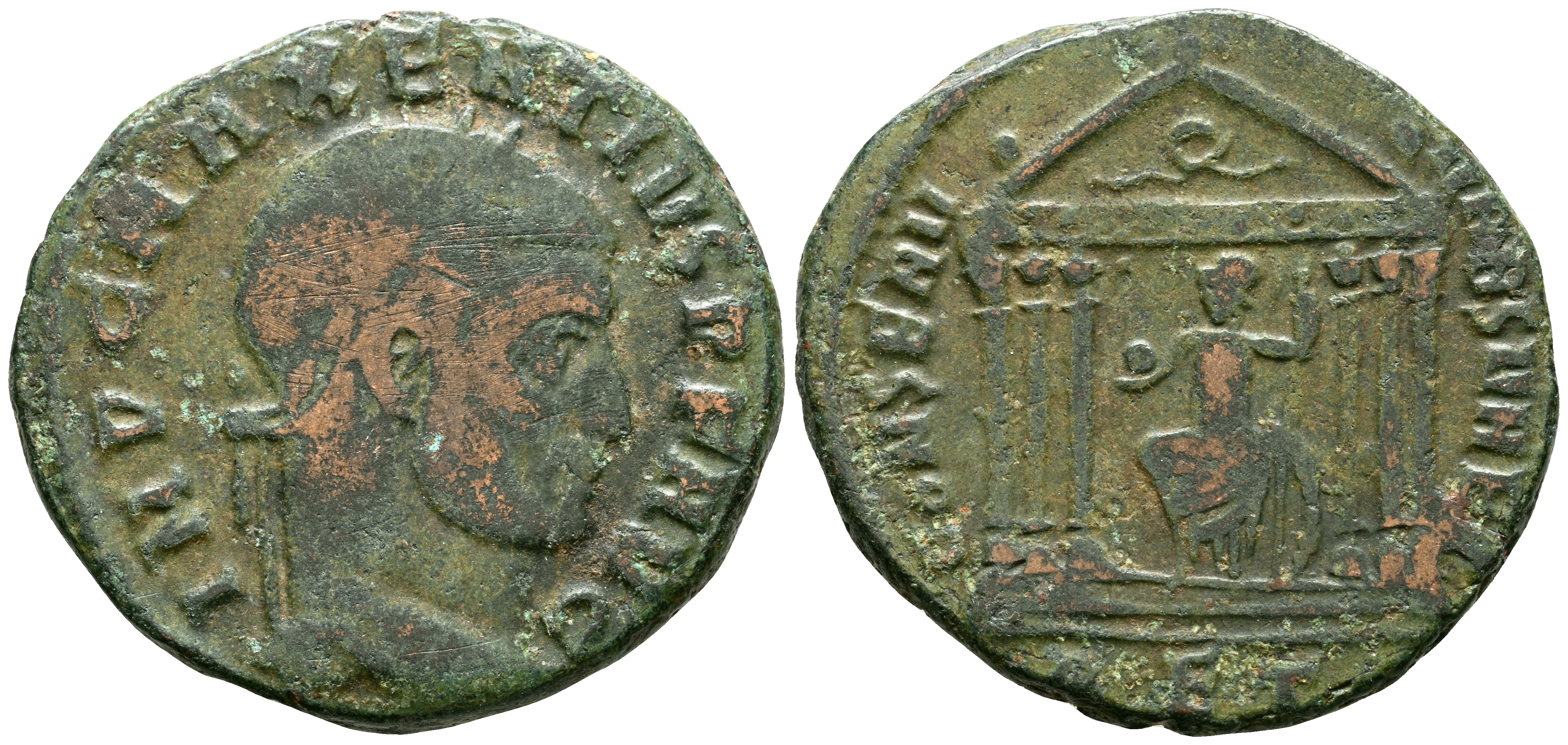 MAXENTIUS. Follis. (Ae. 5.59g/24mm). 310-311 AD Rome. (RIC 258). Obv: Laureate head of Maxentius facing right, around legend: IMP C MAXENTIVS PF AVG. Rev: Roma seated facing left holding spear and globe within a hexastyle temple, in exergue: RET, around legend: CONSERV VRB SVAE. Very Fine.