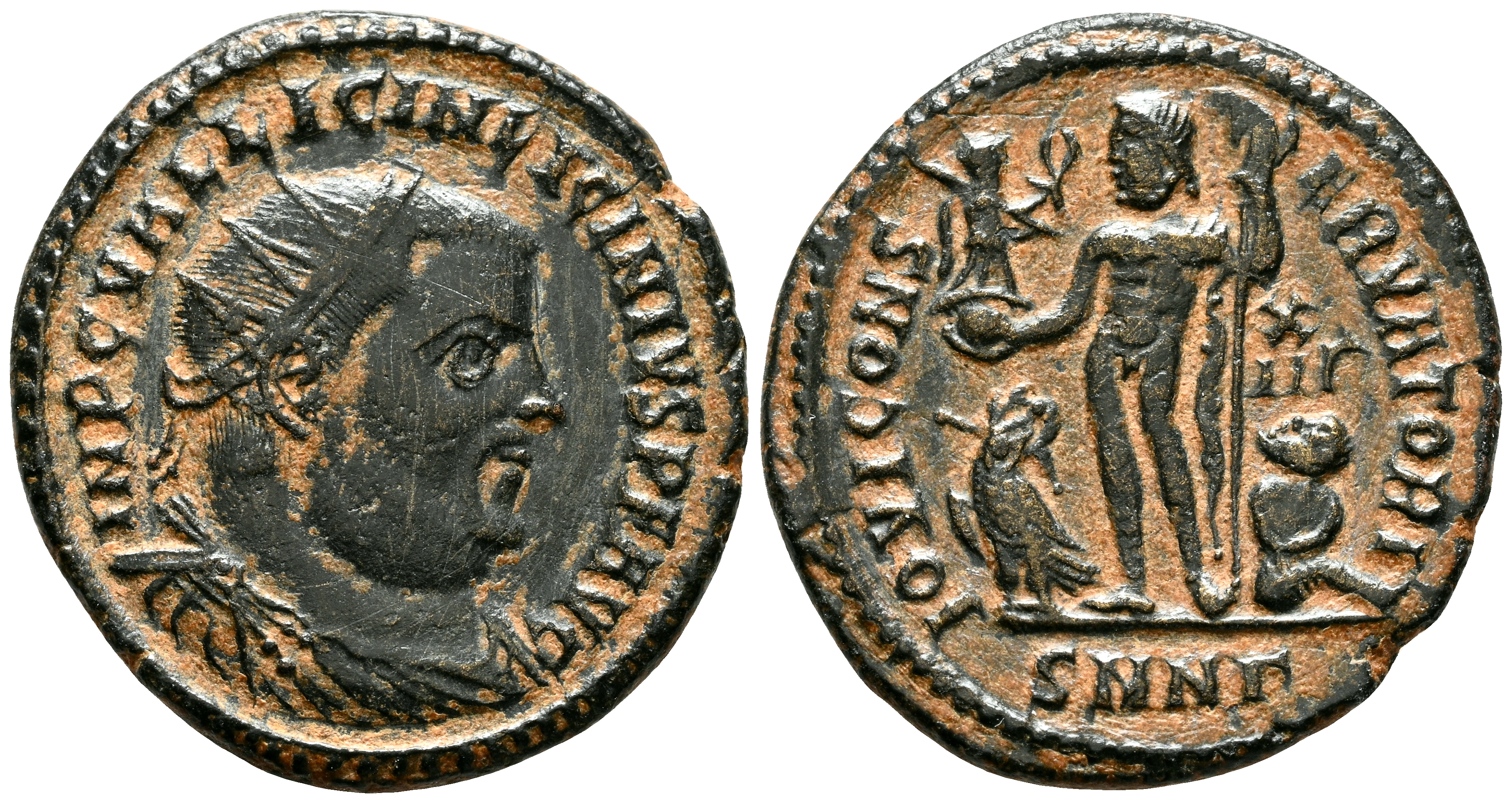 English Licinius I. Antoninianus. (Ae. 3.03g/20mm). 317–320 AD Nicomedia. (RIC 52). Obv: Radiate and draped cuirassed bust of Licinius I facing right, around legend: IMP C VAL LICIN LICINIVS PF AVG. Rev: Jupiter standing left holding Victoria with laurel wreath and scepter, at her feet, eagle right with laurel wreath in beak and seated captive to the right, in field: X/III, in exergue: SMNr, around legend: IOVI CONSERVATORI. Good Very Fine.