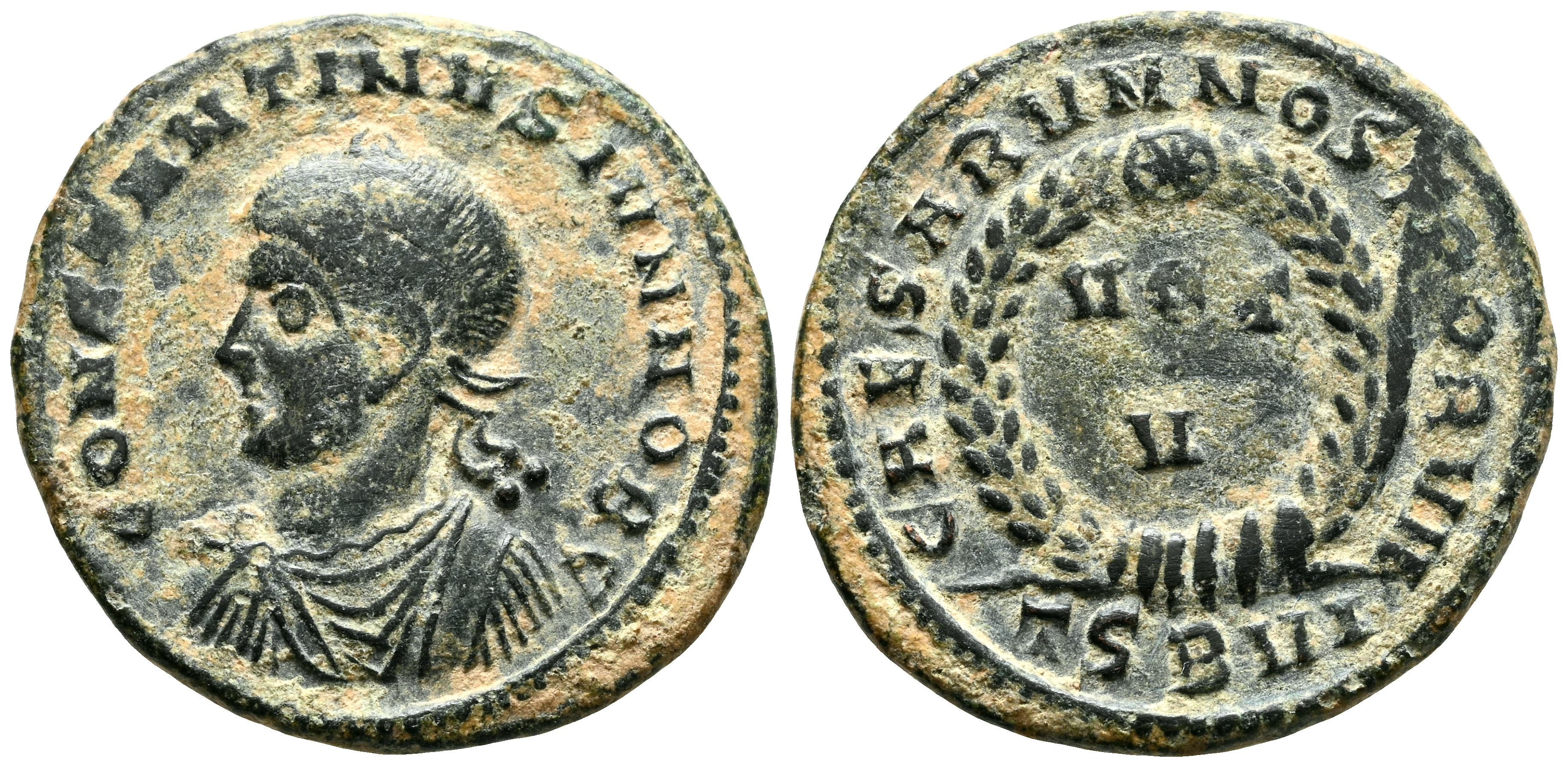 CONSTANTINE II. Follis. (Ae. 2.69g/19mm). 324 AD Thessaloniki. (RIC 128). Obv: Laureate, draped, and cuirassed bust of Constantine II facing left, around legend: CONSTANINVS IVN NOB C. Rev: Legend; VOT V, within a laurel wreath, below: TSB VI, around legend: CAESARVM NOSTRORVM. Very Fine/Good Very Fine.