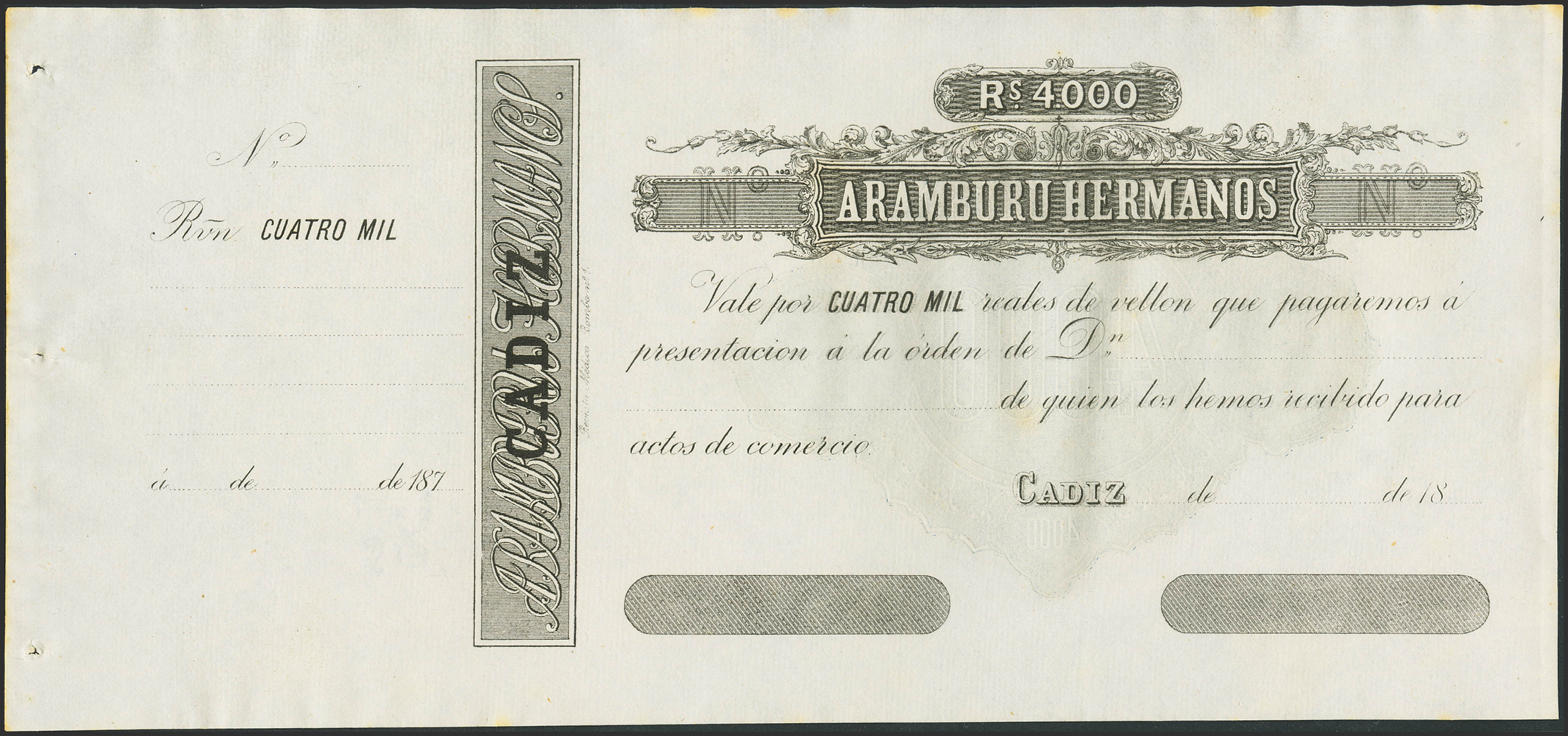 English 4000 Reales de Vellón. (18__ca). Aramburu Hermanos, Cádiz (matrix on the left). Slightly toned at the edges. Uncirculated--. For a better understanding of the context of this banknote, we recommend the work "Obligations, vouchers and documents put into circulation as paper money in Spain", by Don Ramón Cobo Huici.