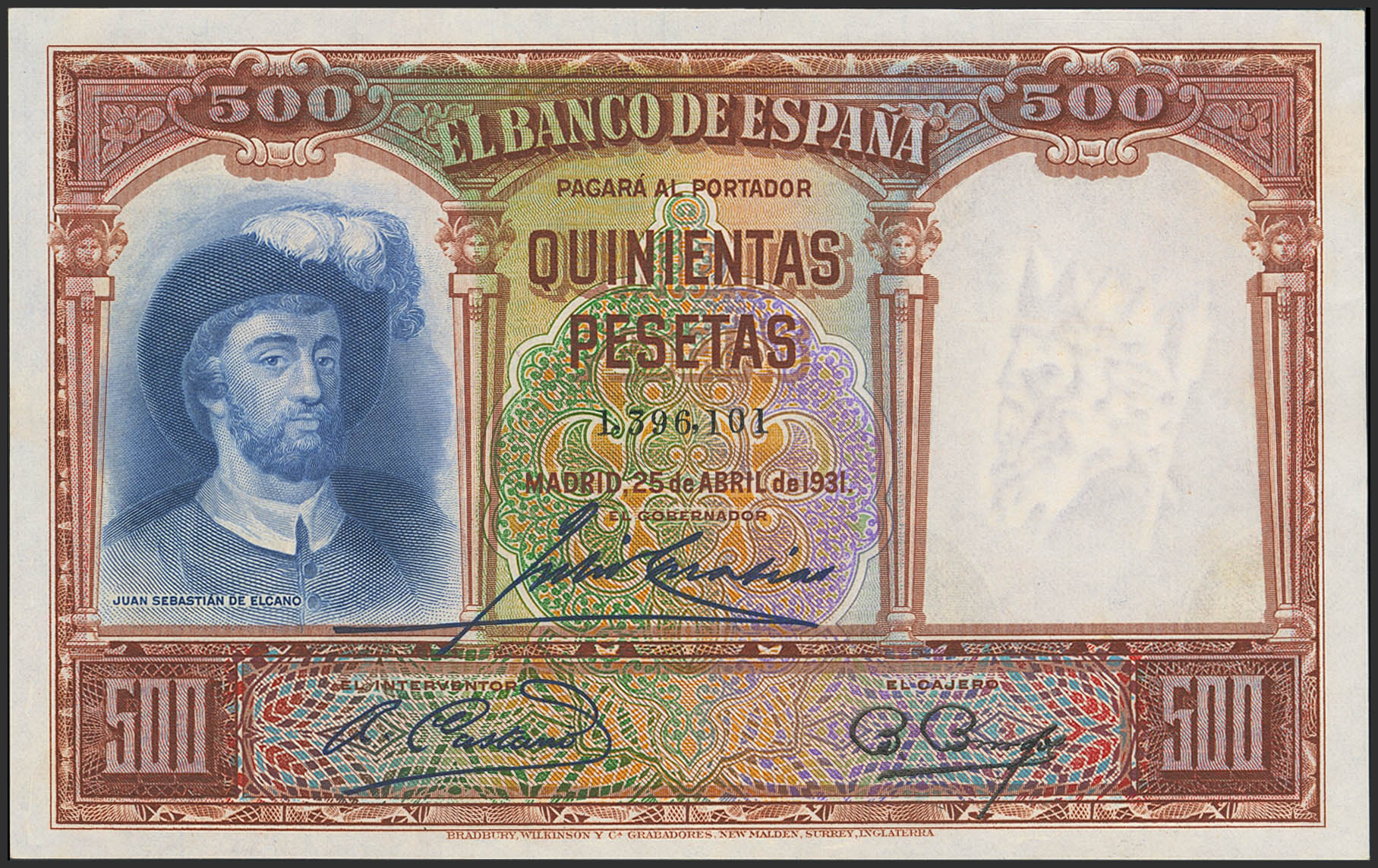 500 Pesetas. April 25, 1931. No series. (Edifil 2023: 361). Original finish. Uncirculated-.