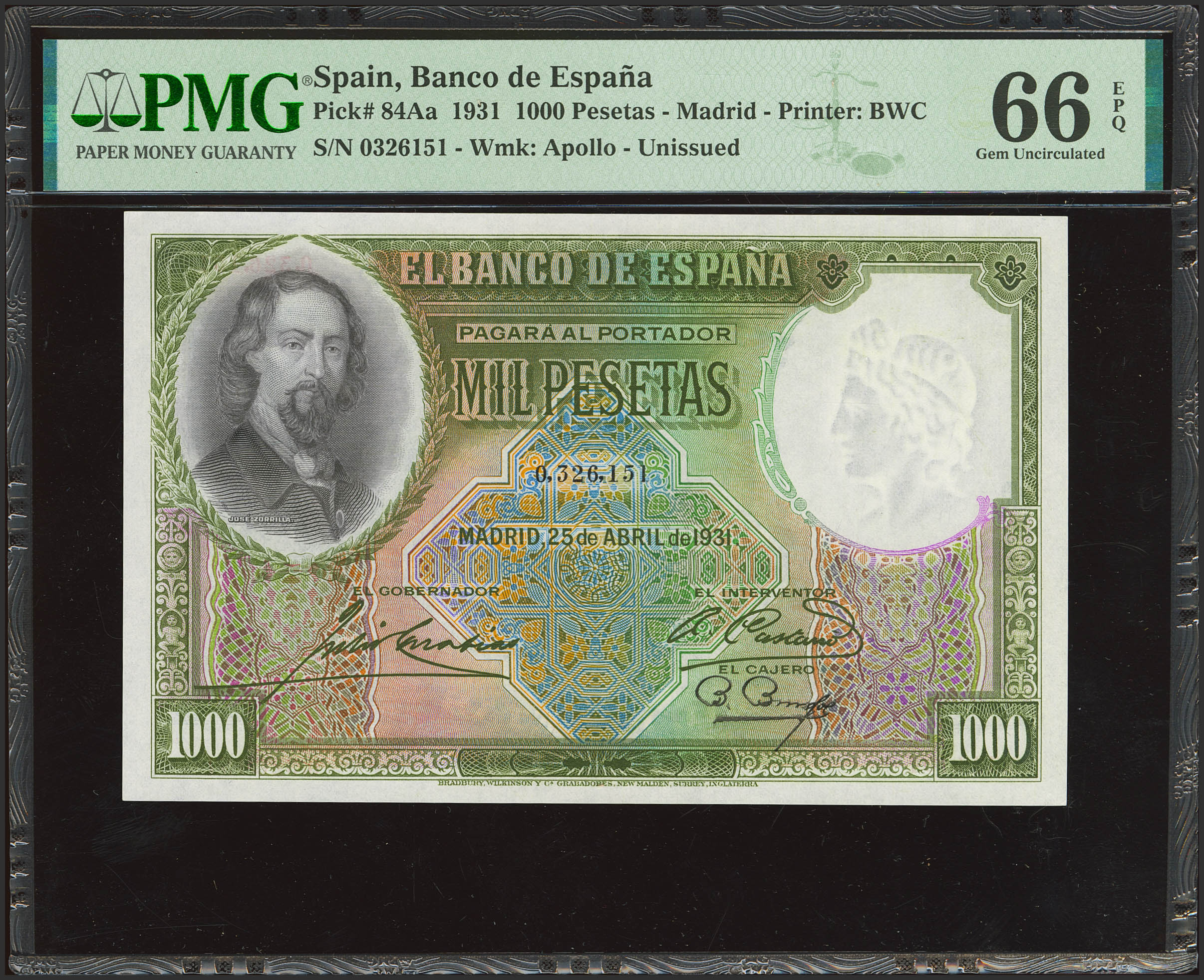 English 1000 Pesetas. April 25, 1931. No serial number. (Edifil 2021: 362, Pick: 84Aa). Exceptionally rare in this condition, original finish. Uncirculated. Encapsulated PMG66EPQ.