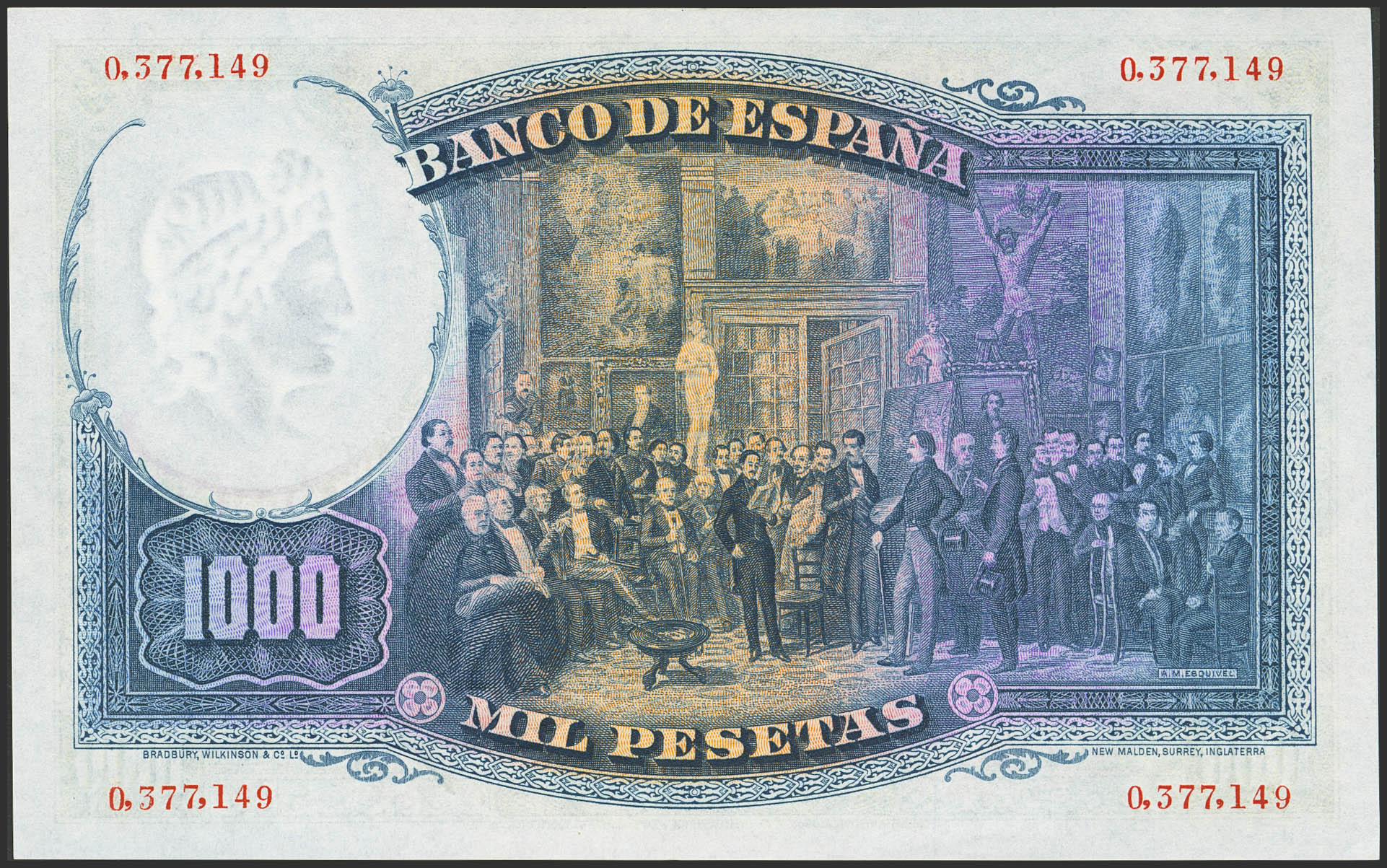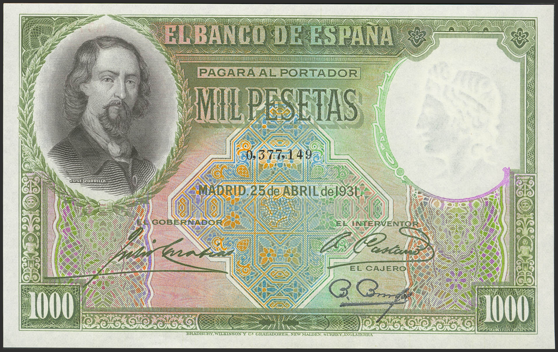 English 1000 Pesetas. April 25, 1931. No serial number. (Edifil 2021: 362). Rare, retains all its original finish. Uncirculated-.