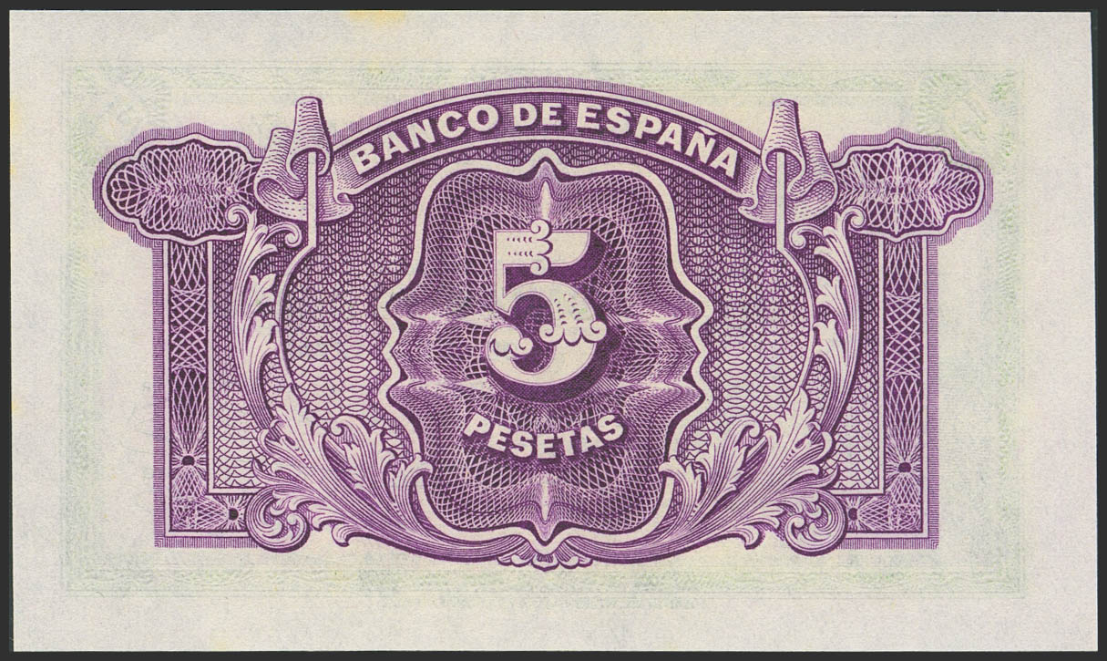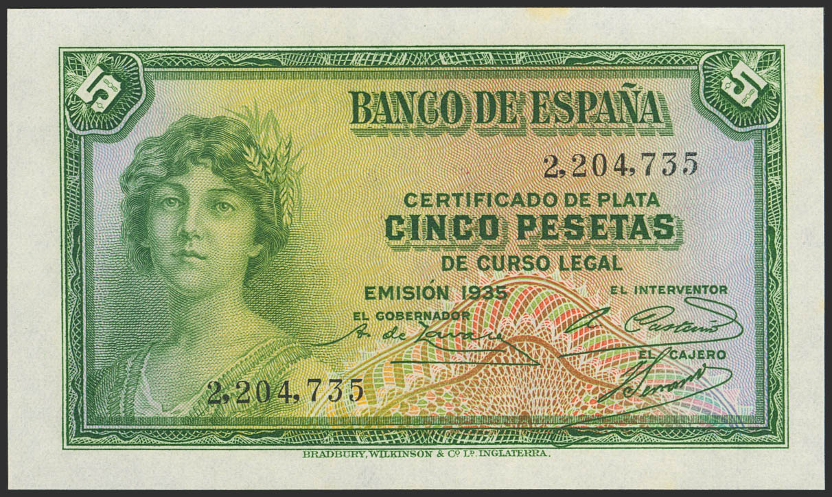 5 Pesetas. 1935. Silver Certificate. No series. (Edifil 2023: 363). Original finish. Uncirculated-.