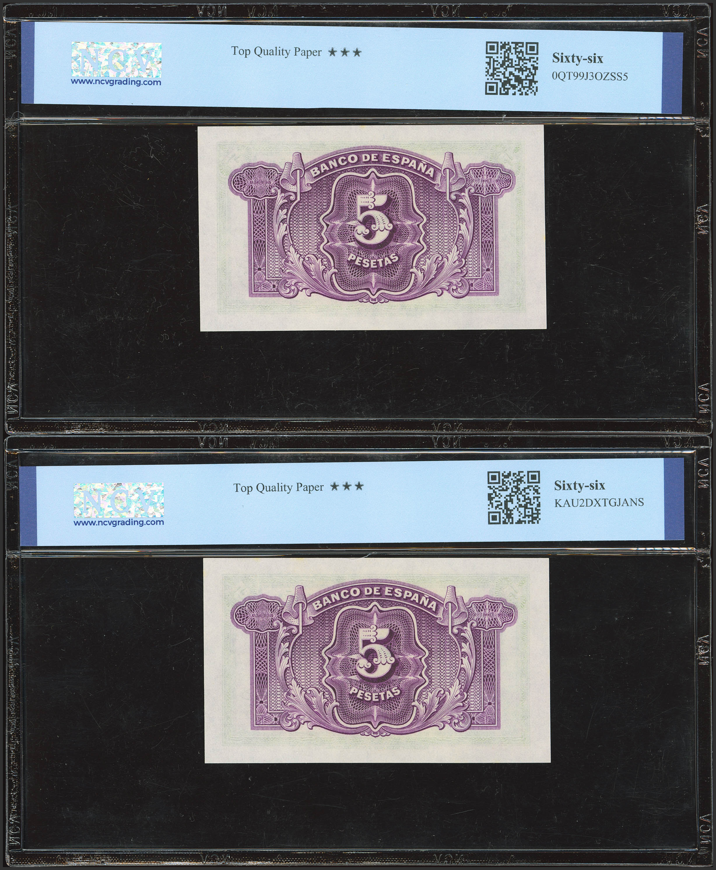 English 5 Pesetas. 1935. Silver Certificate. Consecutive pair. No serial number. (Edifil 2023: 363, Pick: 85a). Original finish. Uncirculated. Both encapsulated NCV66TPQ.