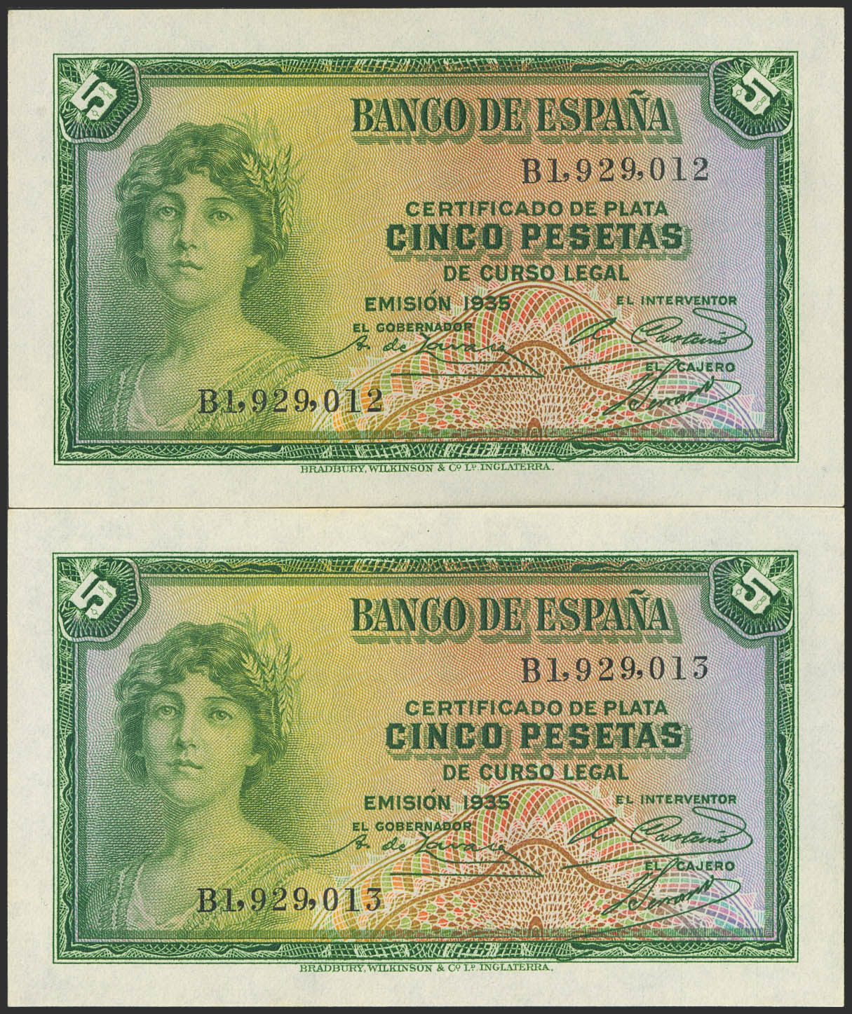5 Pesetas. 1935. Silver Certificate. Consecutive pair. Series B. (Edifil 2023: 363a). Original finish. Uncirculated.