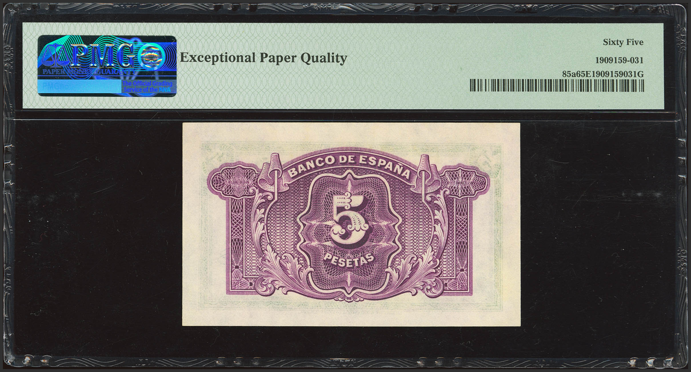English 5 Pesetas. 1935. Silver Certificate. Series C. (Edifil 2023: 363a, Pick: 85a). Unusual in this exceptional quality, original finish. Uncirculated. Encapsulated PMG65EPQ.