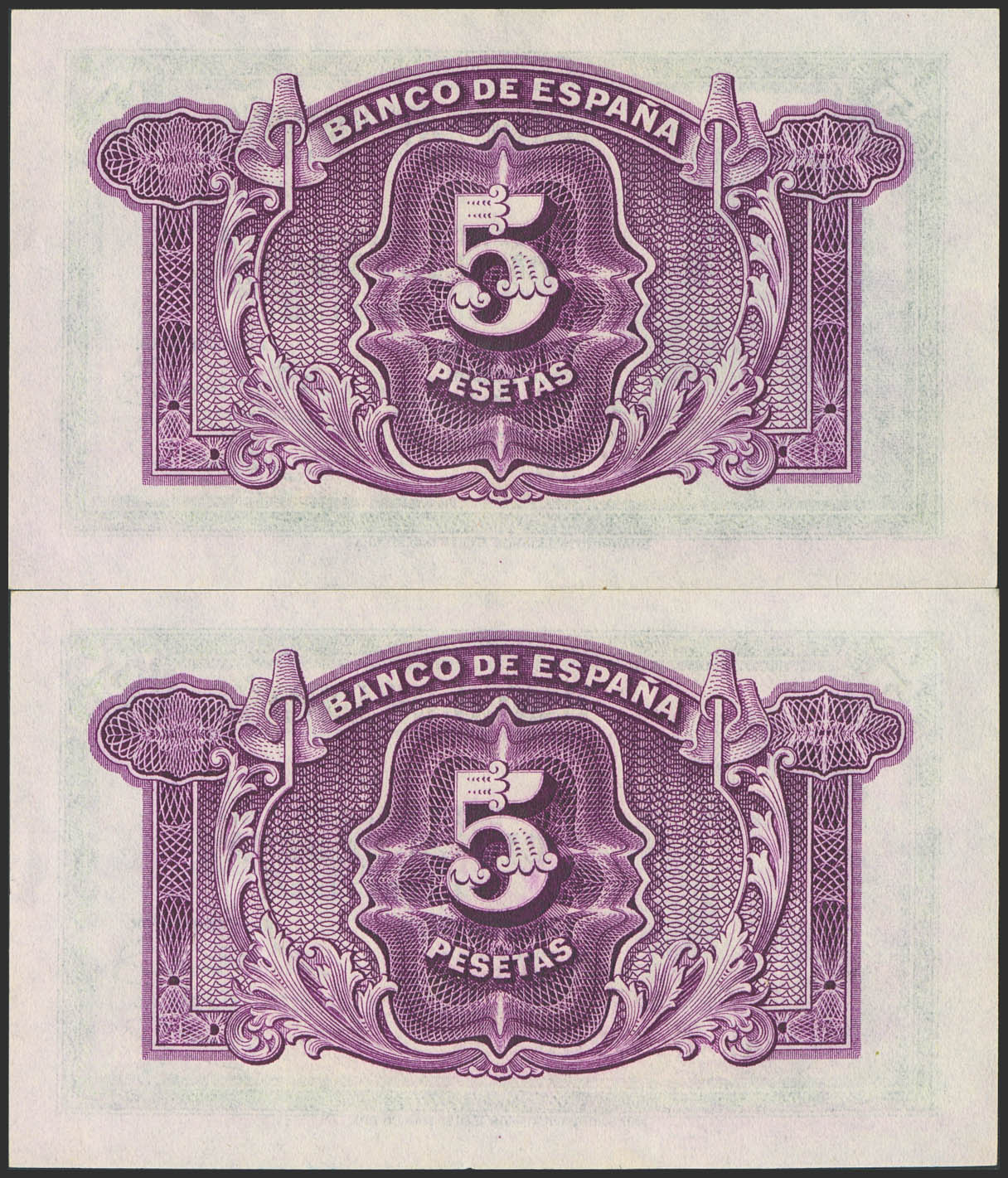 5 Pesetas. 1935. Silver Certificate. Consecutive pair. Series C. (Edifil 2023: 363a). Original finish. Uncirculated-.