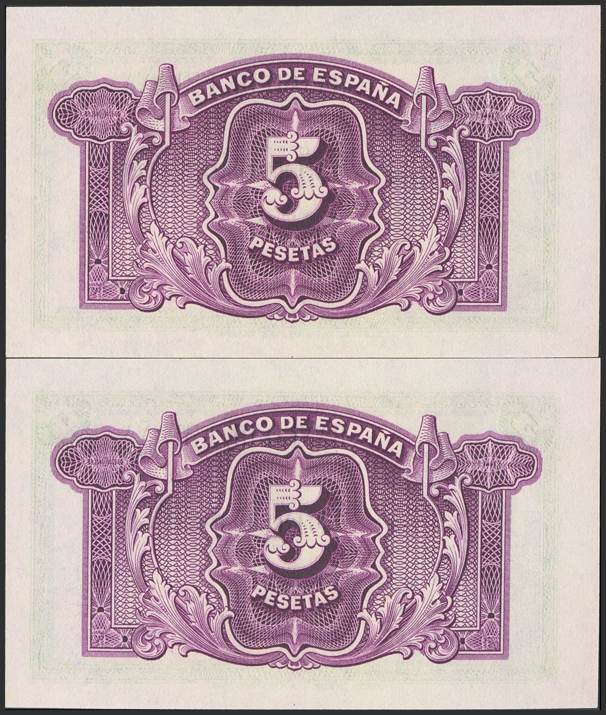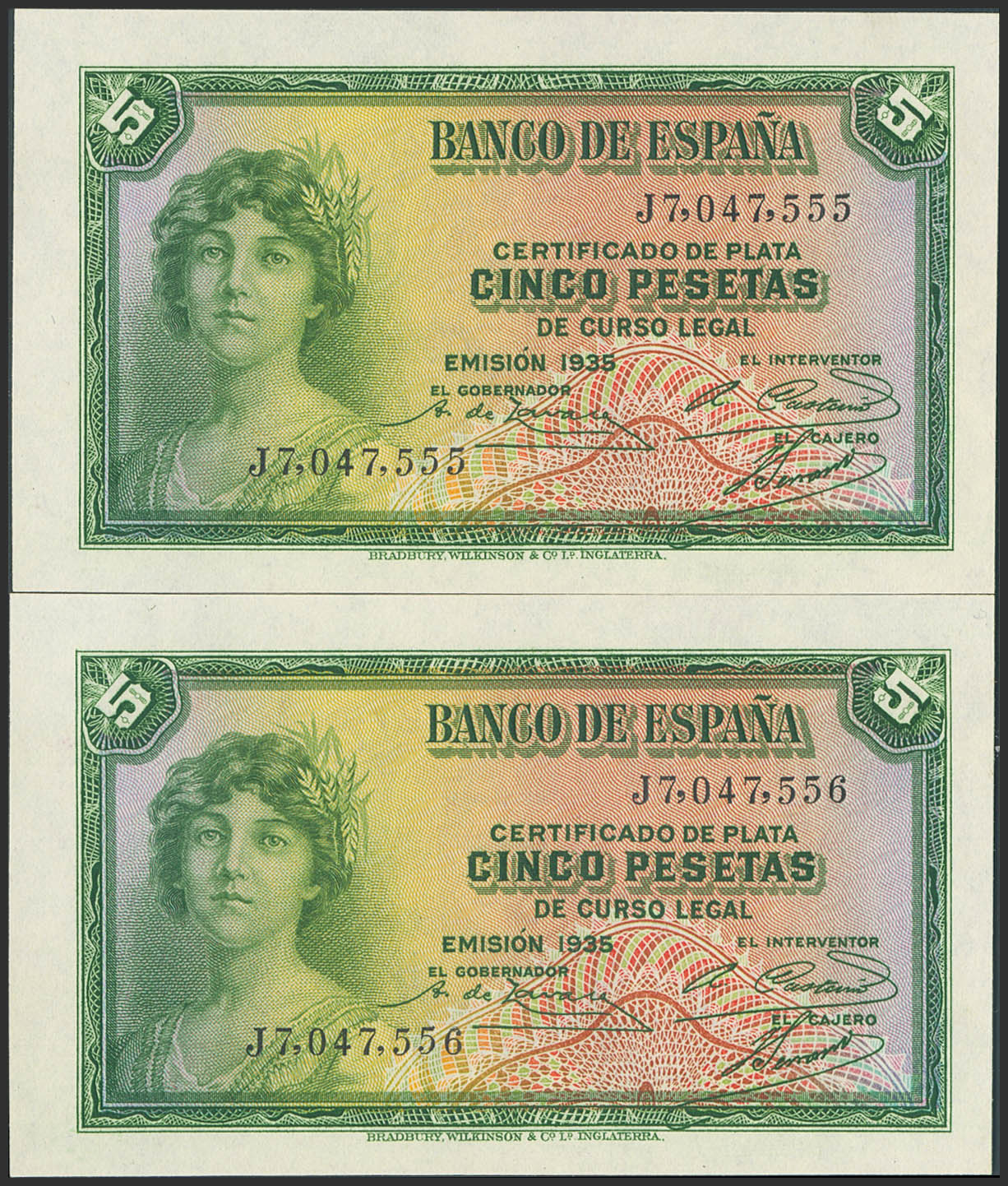 English 5 Pesetas. 1935. Silver Certificate. Consecutive pair. Series J. (Edifil 2023: 363b). Original finish. Uncirculated.