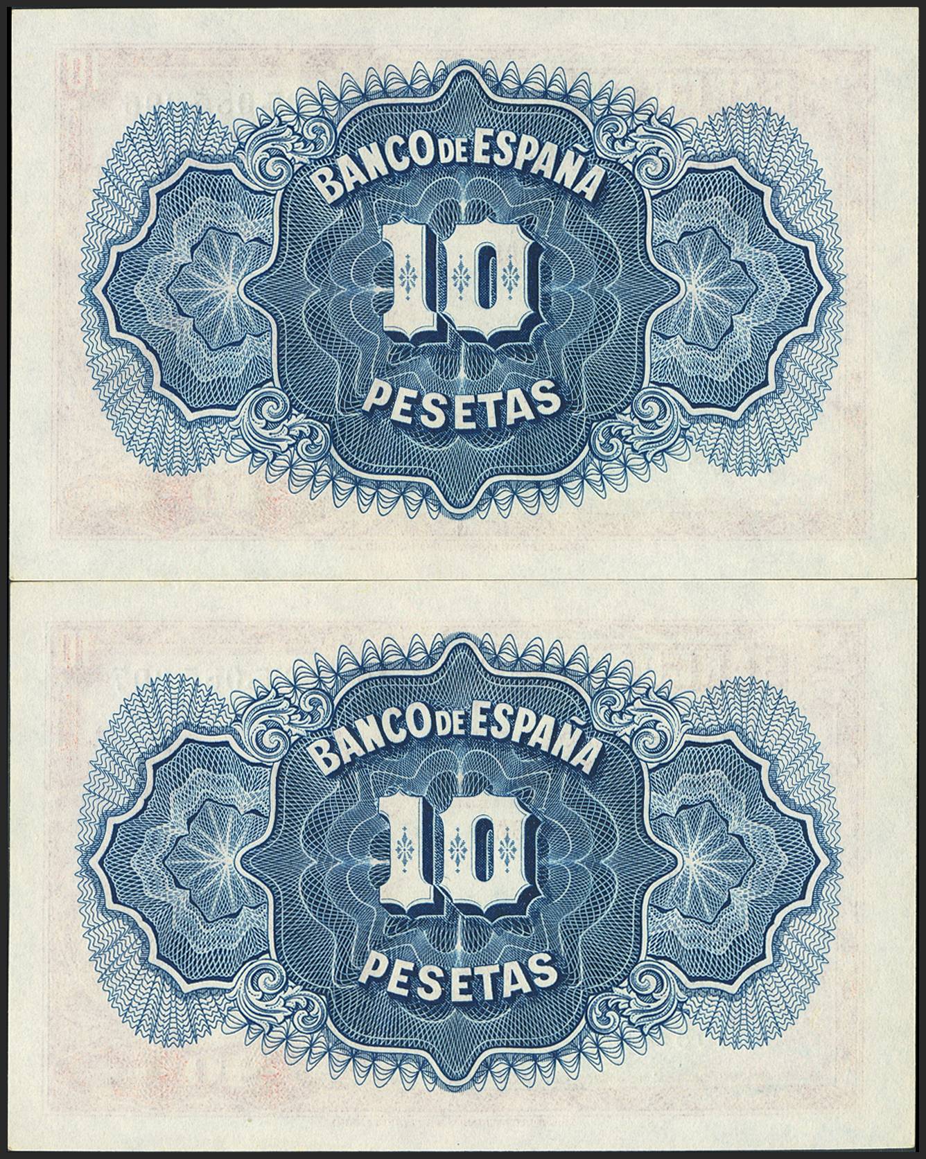 English 10 Pesetas. 1935. Silver Certificate. Consecutive pair. Series B. (Edifil 2023: 364a). Original finish. Uncirculated.