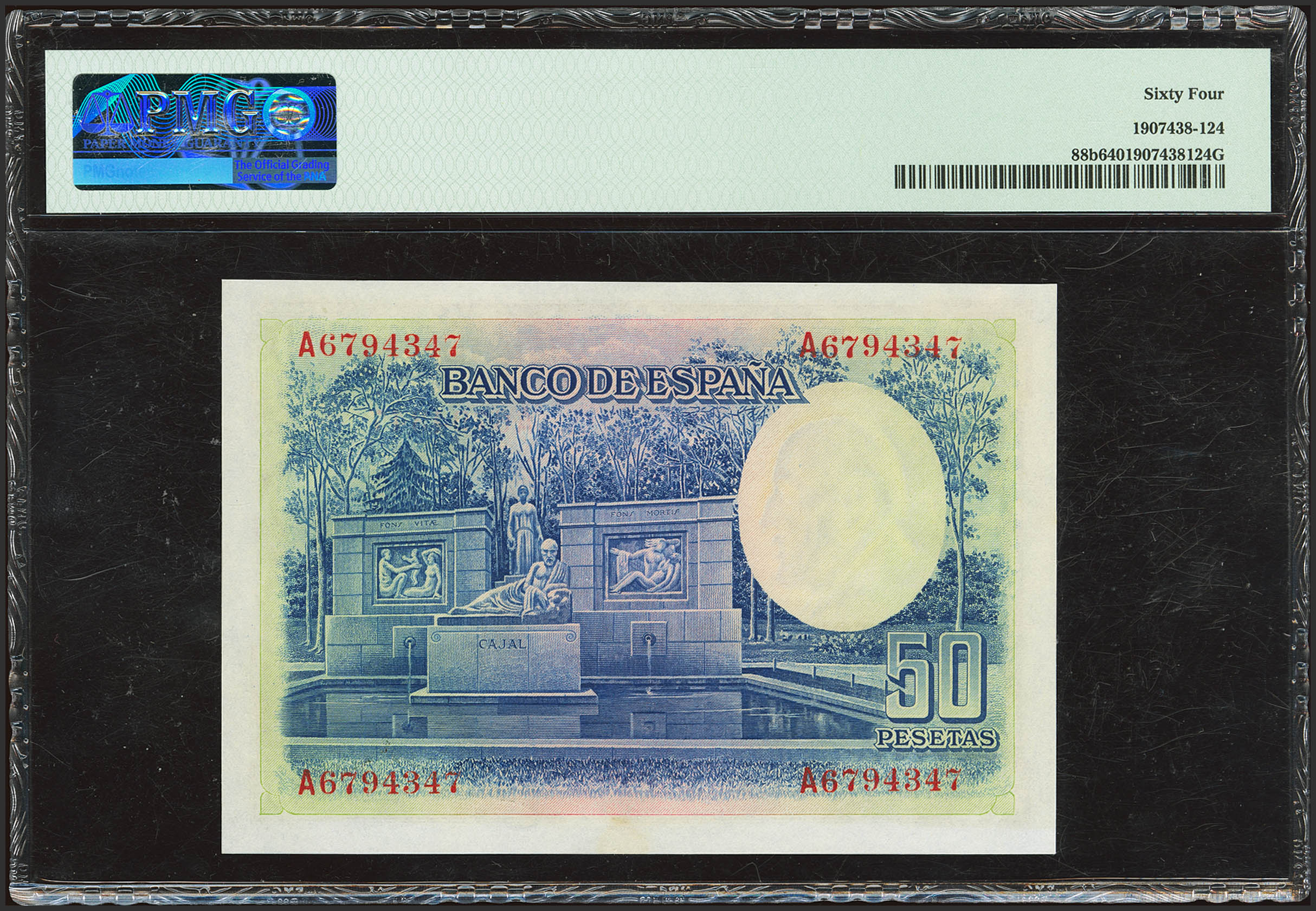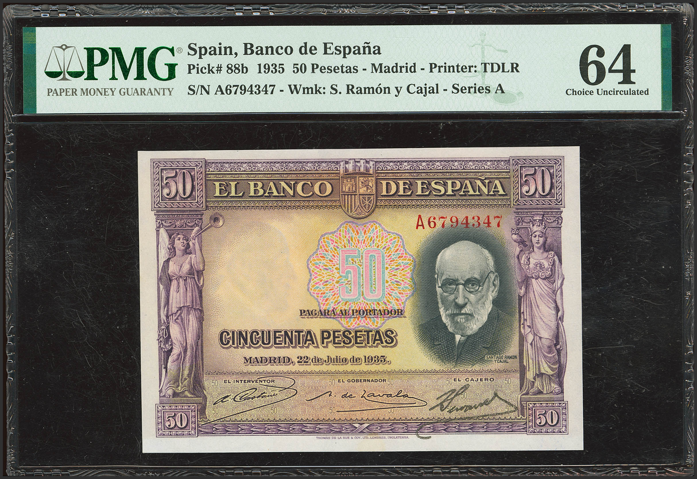 English 50 Pesetas. July 22, 1935. Series A. (Edifil 2023: 366a, Pick: 88b). Uncirculated. PMG64 encapsulated.