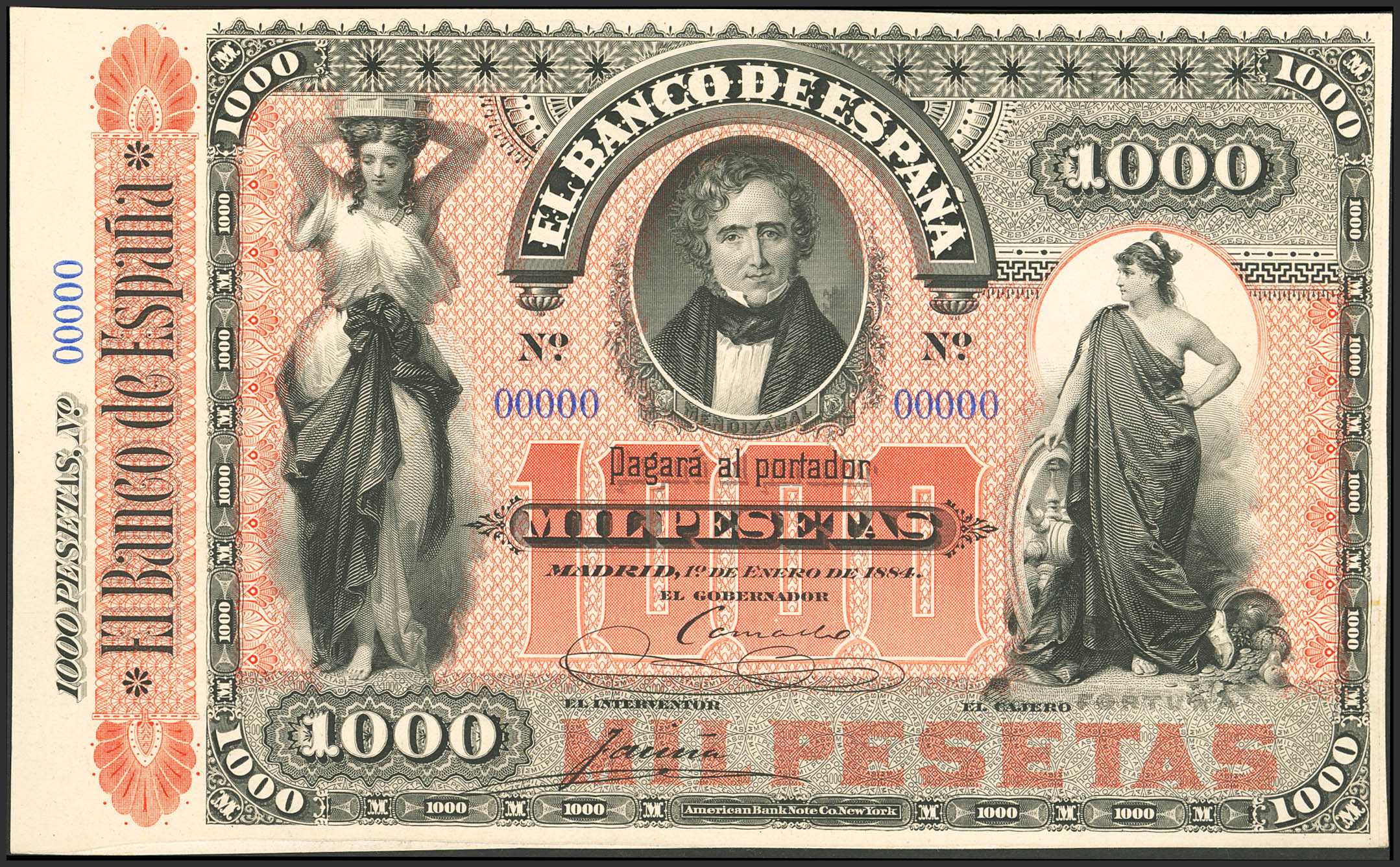 1000 Pesetas. January 1, 1884. Obverse and reverse proofs, serial number 00000, no series. (Edifil 2023: 286M, Pick: 28p1, 28p2). An exceptionally rare proof of one of the most difficult banknotes in the Spanish currency, a piece of enormous importance, mounted on cardboard. Uncirculated.