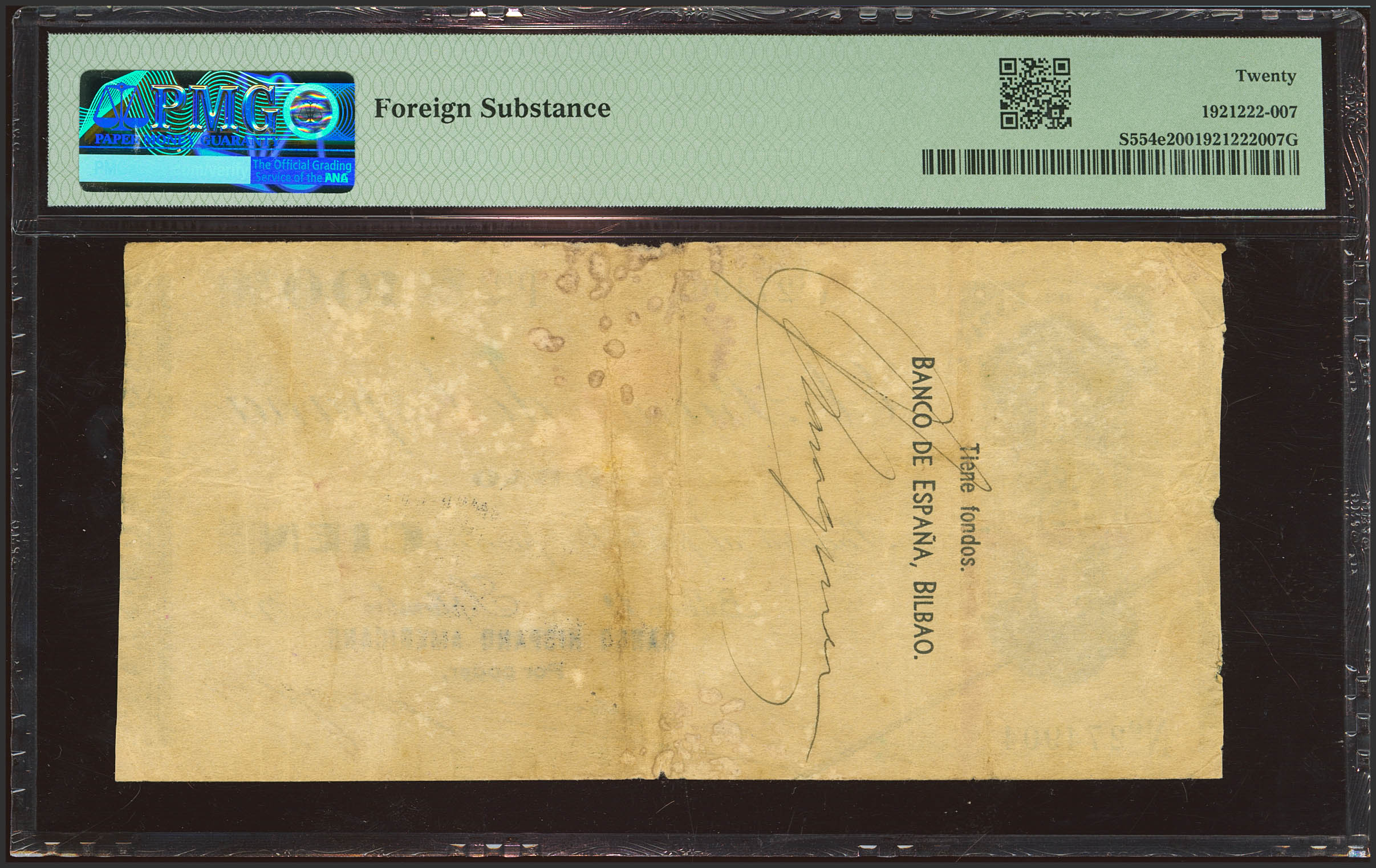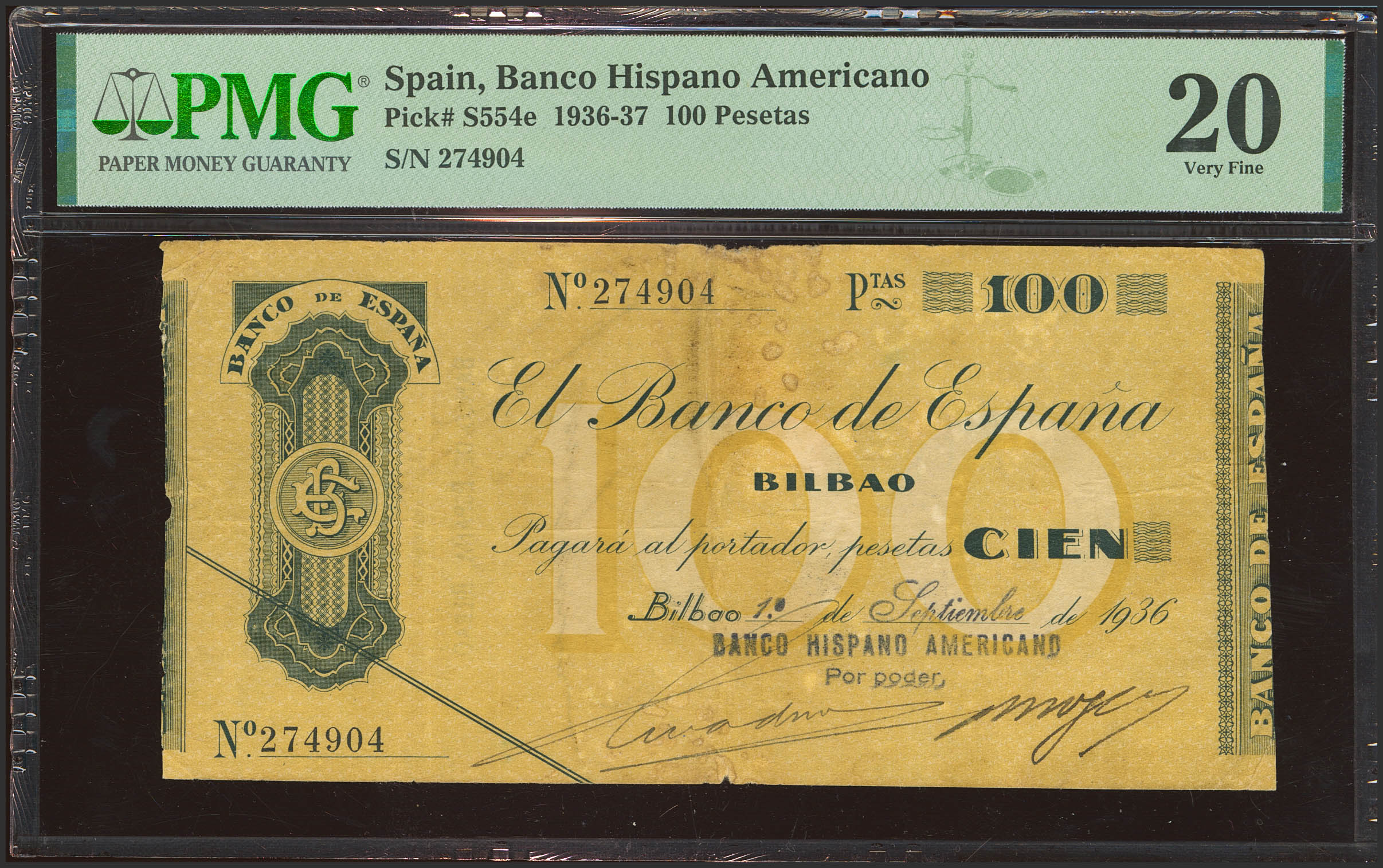 100 Pesetas. September 1, 1936. No serial number. Bilbao branch and signature of Banco Hispano Americano. (Edifil 2023: 371k, Pick: S554e). Good Very Fine. PMG20 (foreign substance) capsule.
