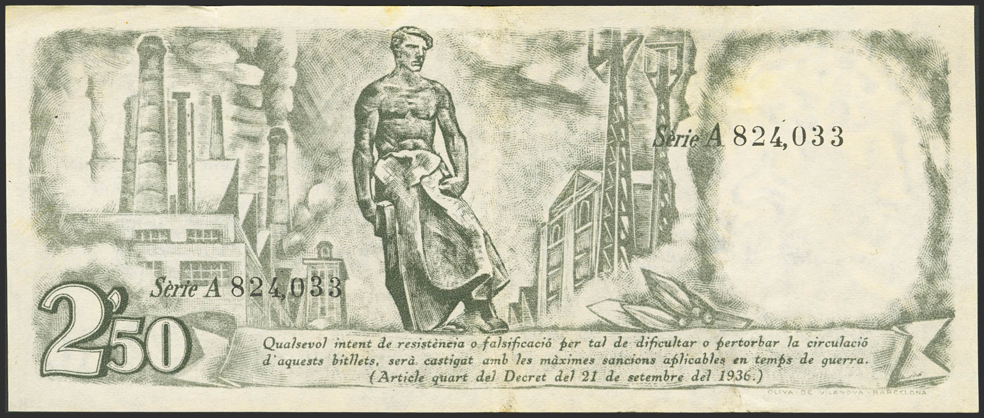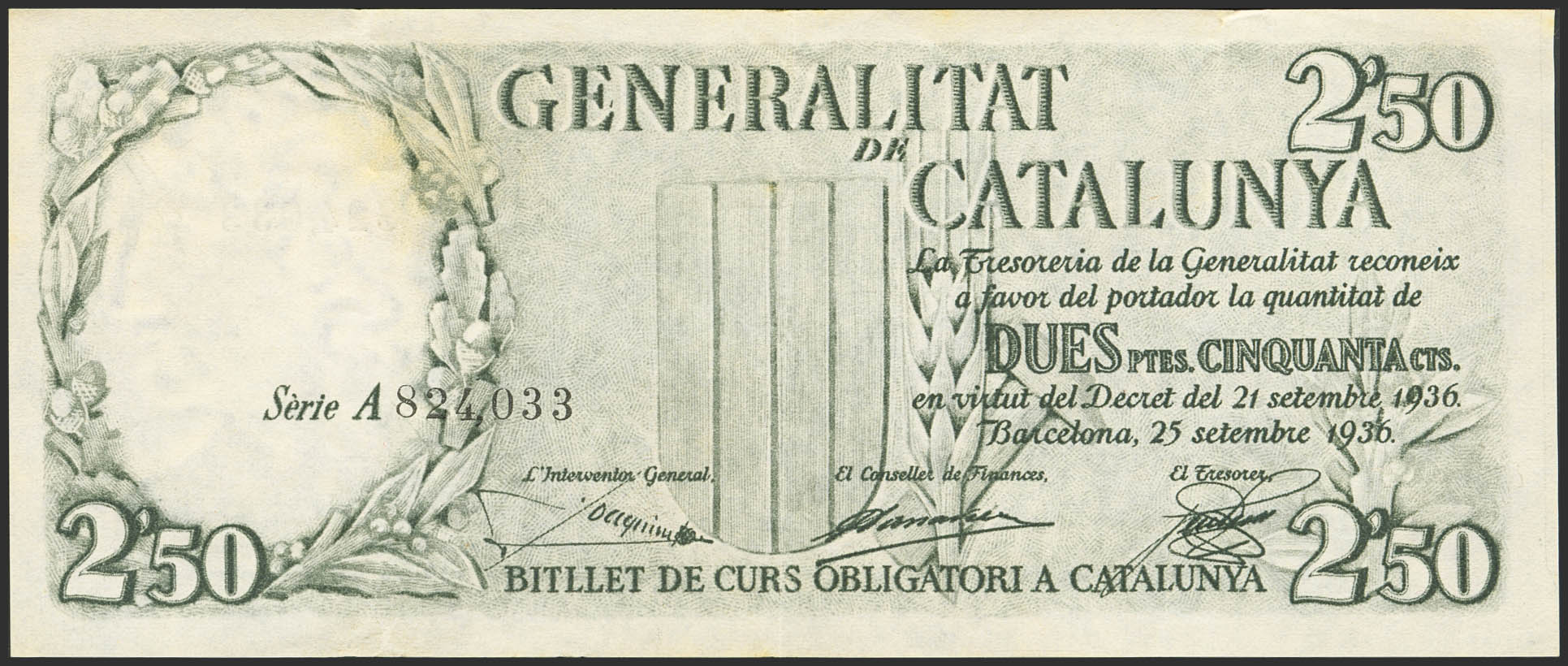 English 2'50 Pessetes. September 25, 1936. Generalitat of Catalonia. Series A. (Edifil 2023: 372). Good Very Fine.