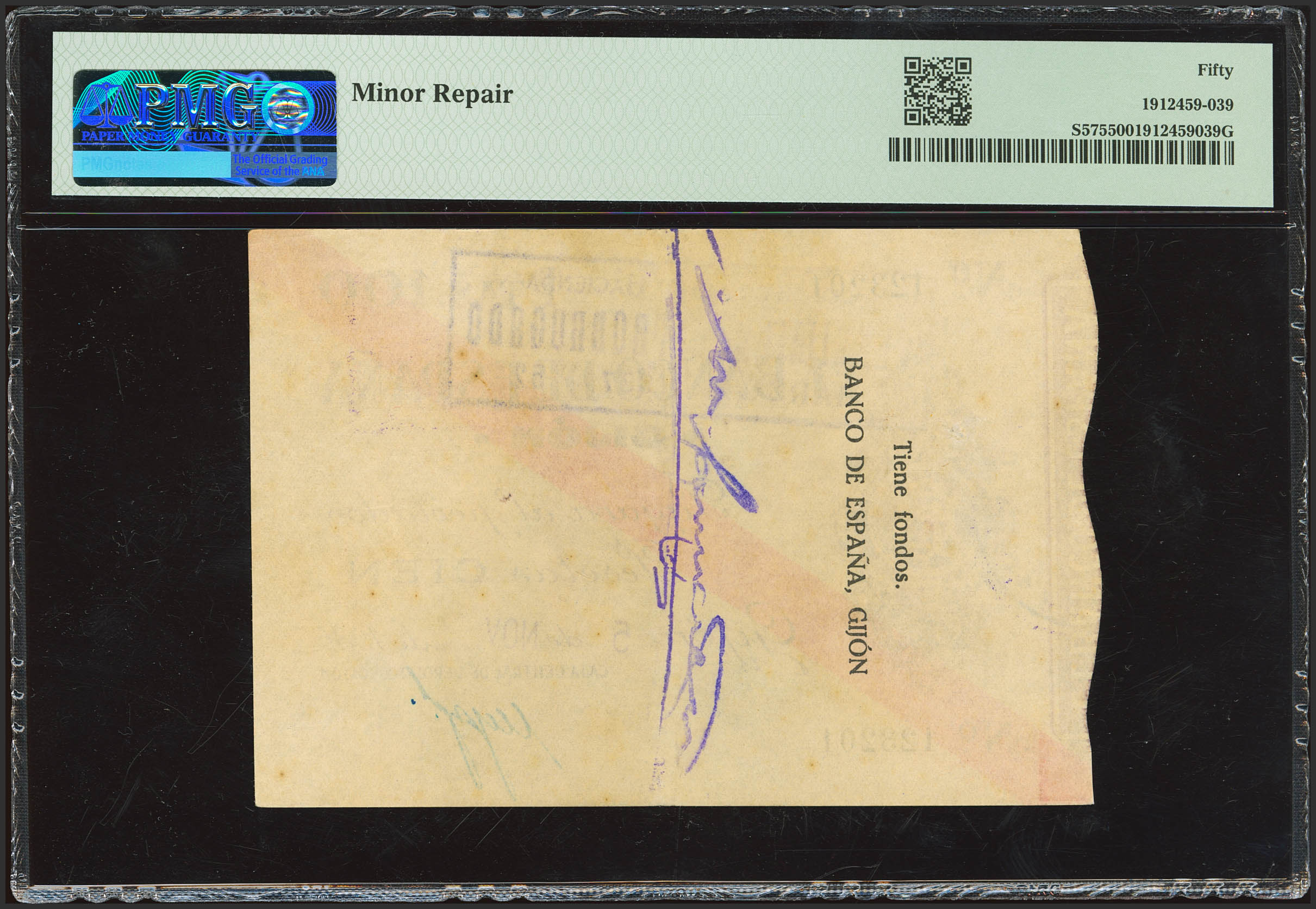 English 100 Pesetas. November 5, 1936. Branch of Banco de Gijón. No serial number. (Edifil 2023: 384, Pick: S575). Minor repairs. EF. PMG50 encapsulation (minor repair).
