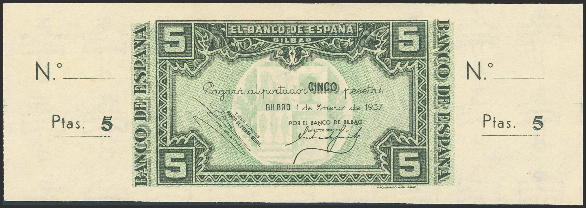 English 5 Pesetas. January 1, 1937. Bilbao Branch, signature Banco de Bilbao. No series or numbering, with both matrices. (Edifil 2023: 385c). Original finish. Uncirculated.