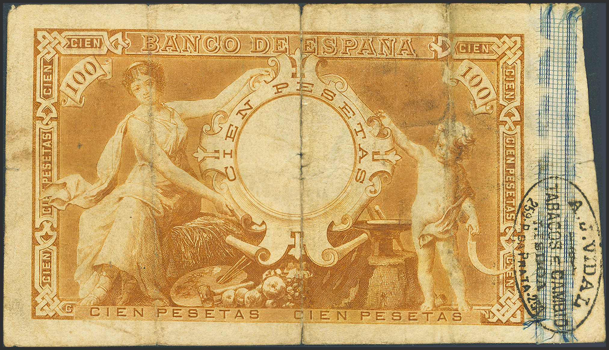 100 Pesetas. June 1, 1889. Series A. (Edifil 2023: 299). Very rare, especially without repairs, with the usual tears along the folds and a Tabaco e Cambios stamp on the reverse. Fine-.