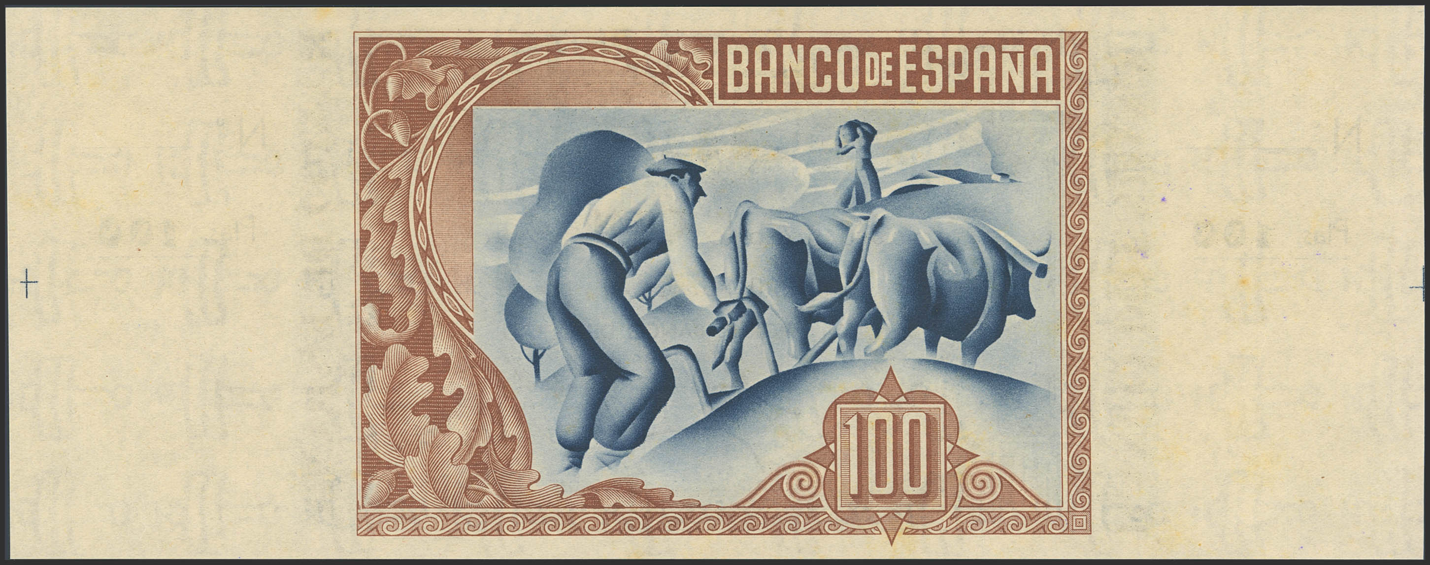 100 Pesetas. January 1, 1937. Bilbao Branch, signature Banco de Bilbao. No series or numbering, with both matrices. (Edifil 2023: 390a). Original finish, age spots. Uncirculated-.