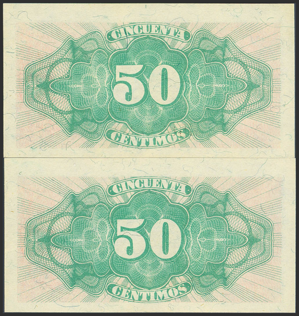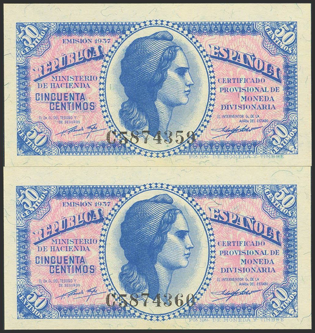 English 50 Centimos. 1937. Consecutive pair. Series C, last series issued. (Edifil 2023: 391a). Original finish. Uncirculated-.