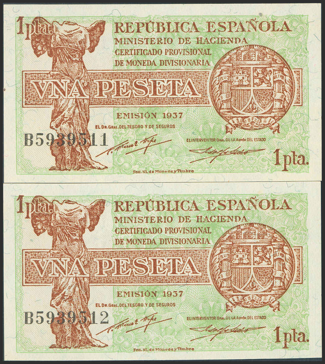 1 Peseta. 1937. Correlative pair. Series B. (Edifil 2023: 392). Original finish. Uncirculated-.