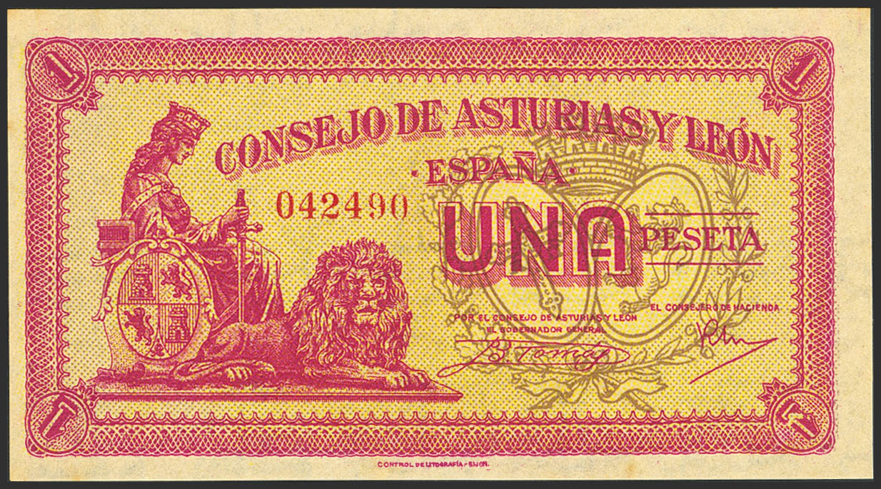 English 1 Peseta. 1937. Asturias and León. No series. (Edifil 2023: 397). Original condition, usual age spots. Uncirculated-.