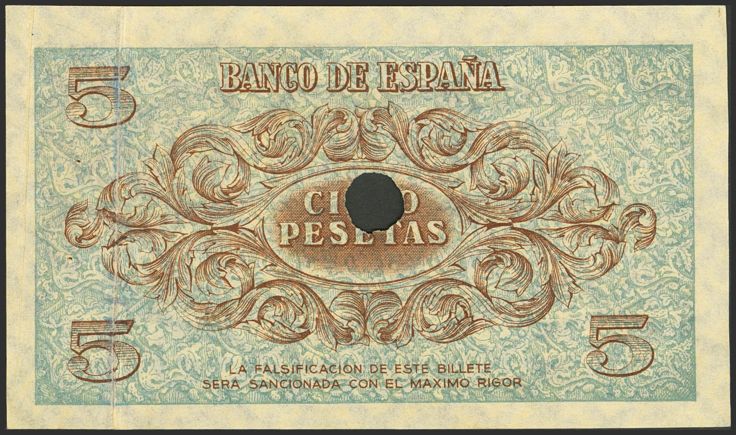5 Pesetas. November 21, 1936. Punched and unnumbered. (Edifil 2021: 417T). Unusual and original finish, staple marks like all known examples. Extremely Fine.