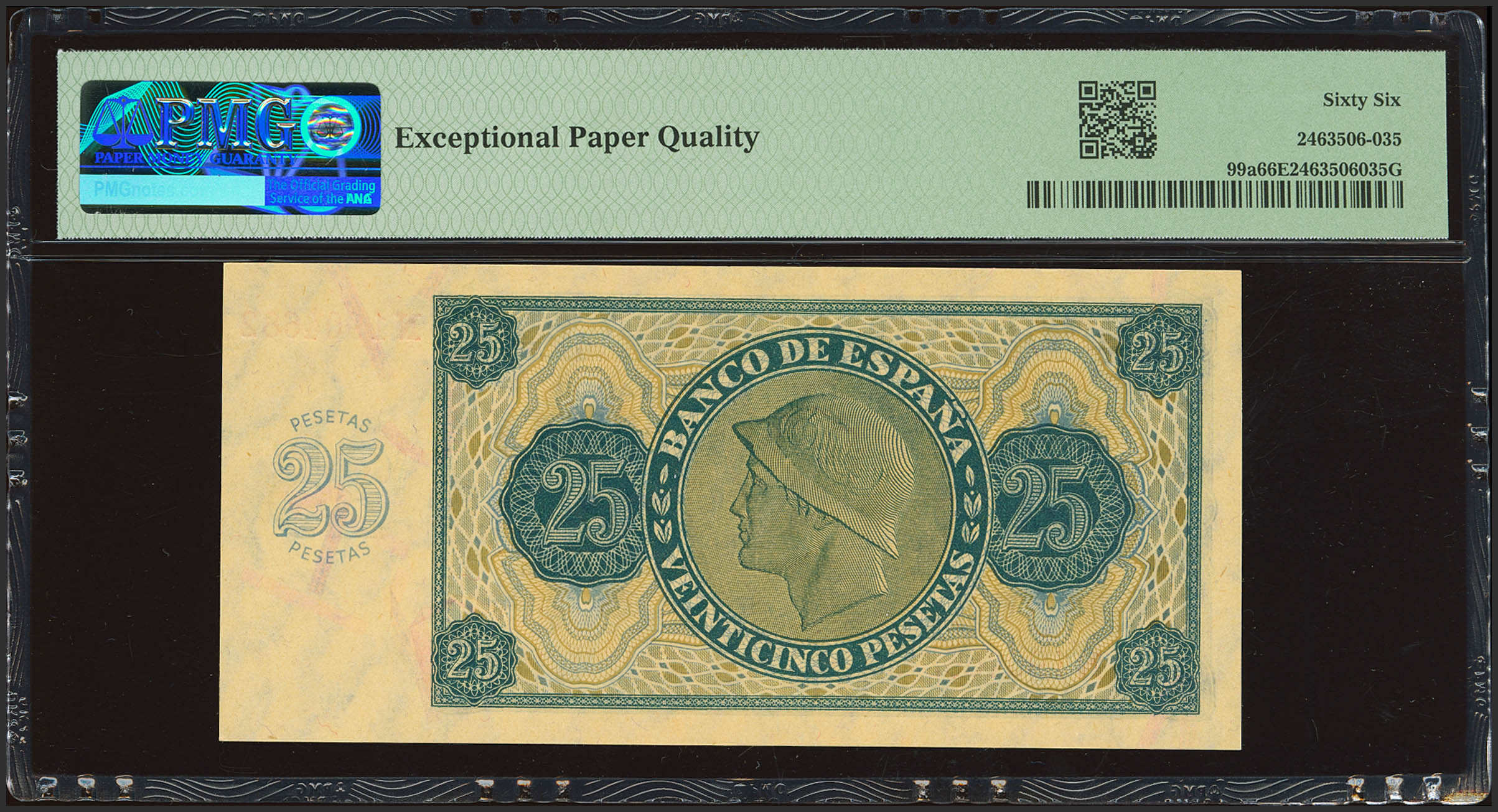25 Pesetas. November 21, 1936. Series N. (Edifil 2023: 419a, Pick: 99a). Original finish. Uncirculated. PMG66EPQ encapsulation.