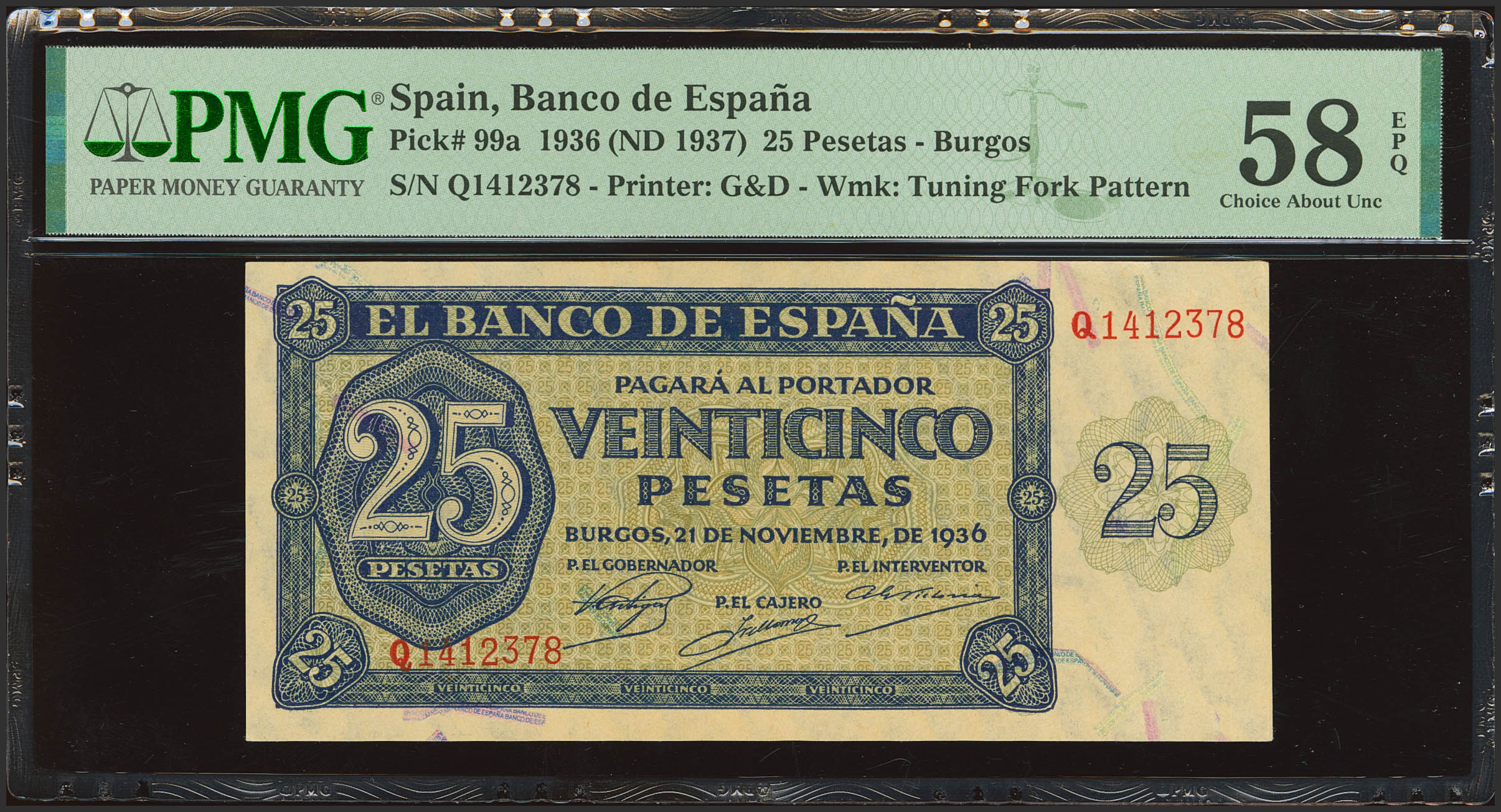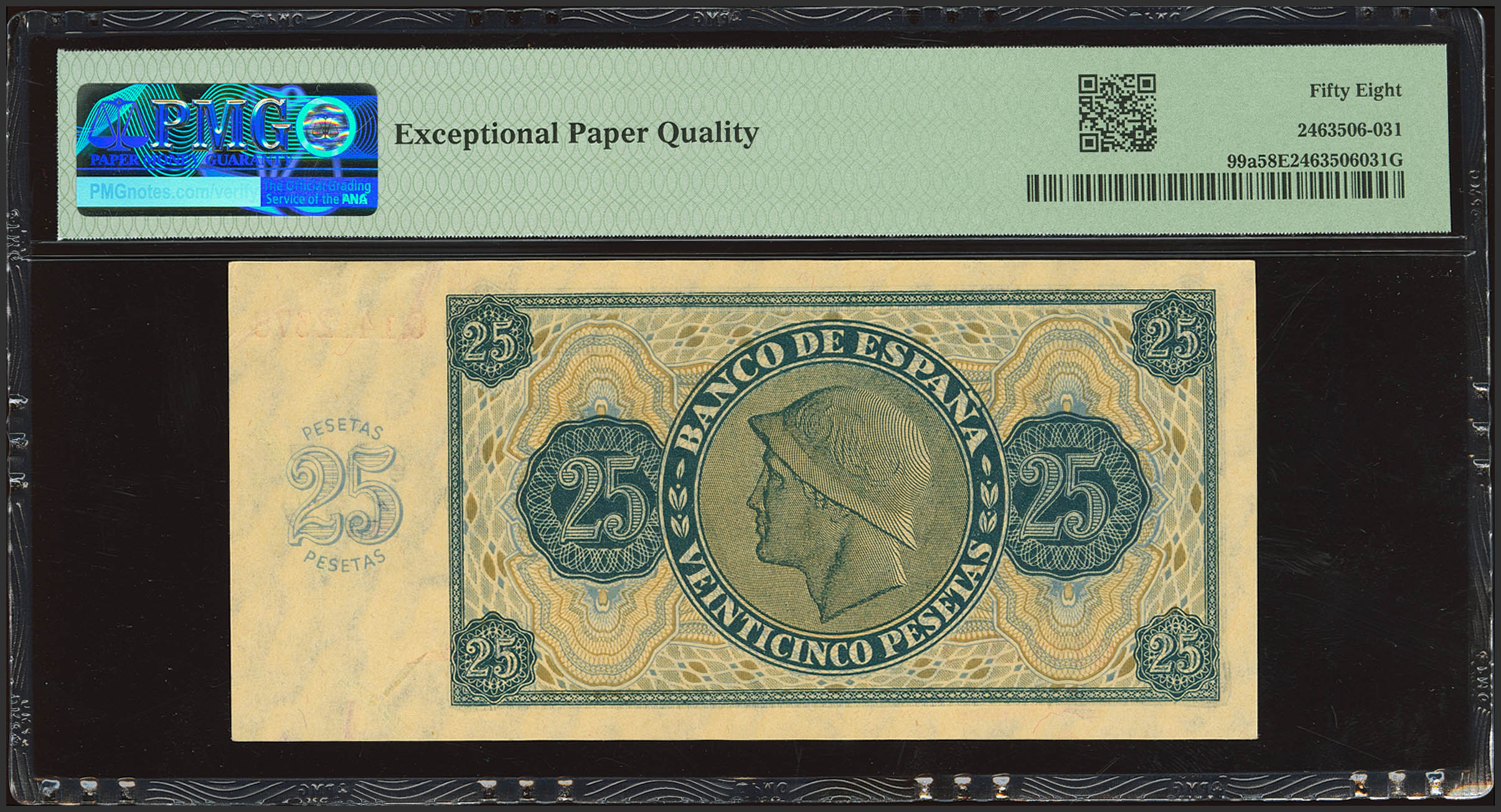 English 25 Pesetas. November 21, 1936. Series Q. (Edifil 2023: 419a, Pick: 99a). Original finish. Good Extremely Fine++. PMG58EPQ package.