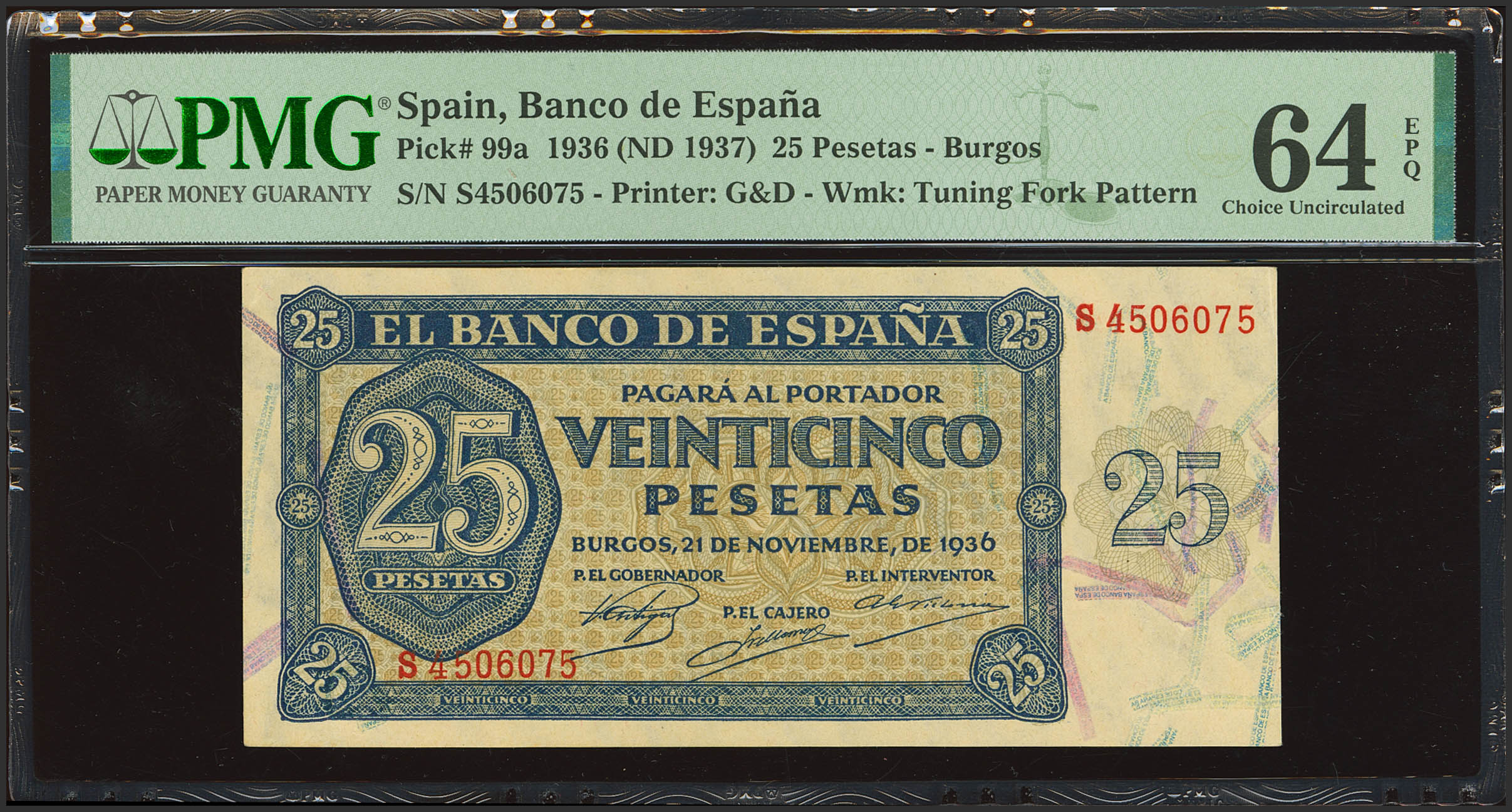 25 Pesetas. November 21, 1936. Series S, last series issued. (Edifil 2023: 419b, Pick: 99a). Unusual. Uncirculated. PMG64EPQ package.