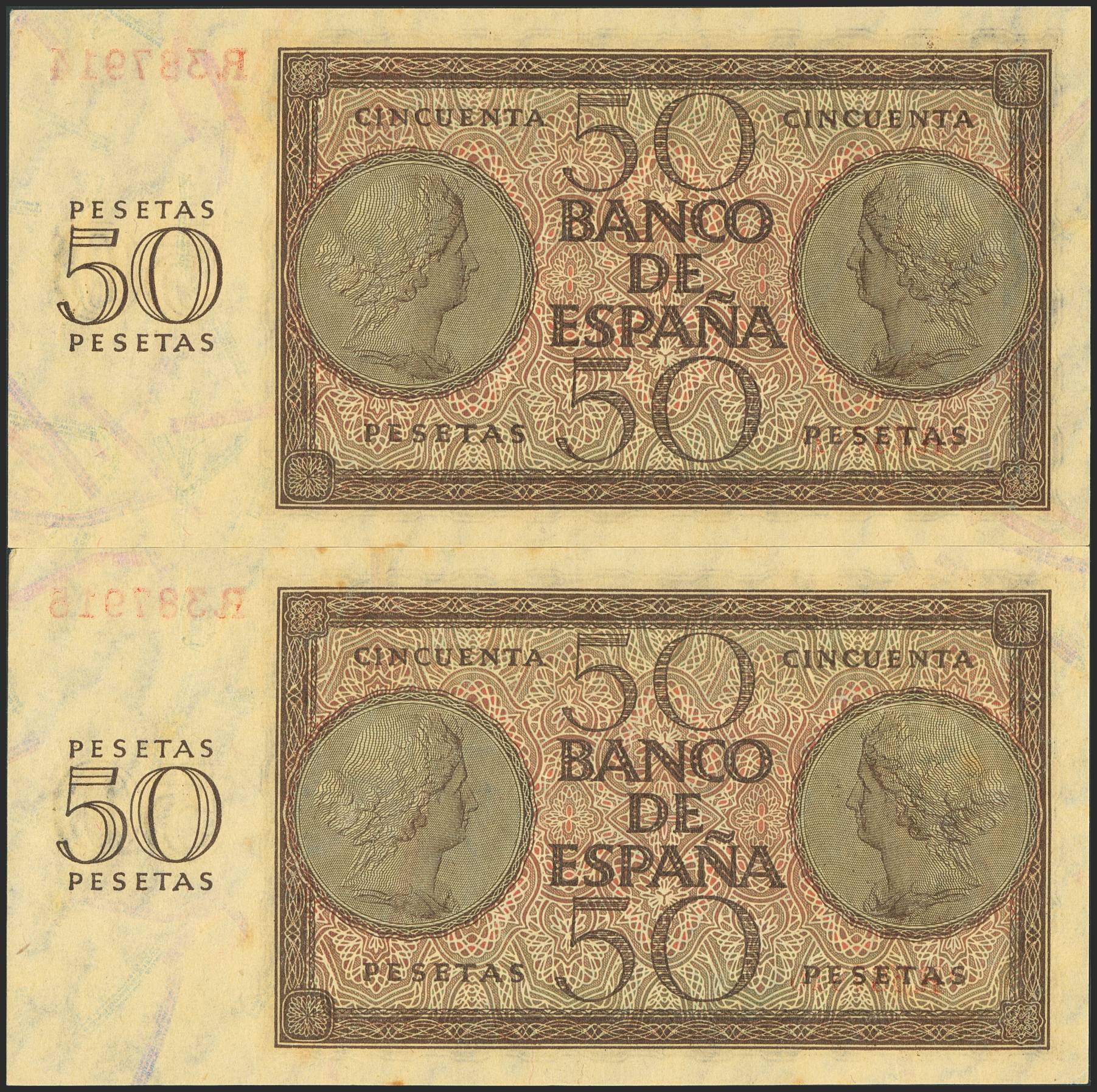 English 50 Pesetas. November 21, 1936. Consecutive pair. Series R. (Edifil 2023: 420a). Original condition. EF+++.