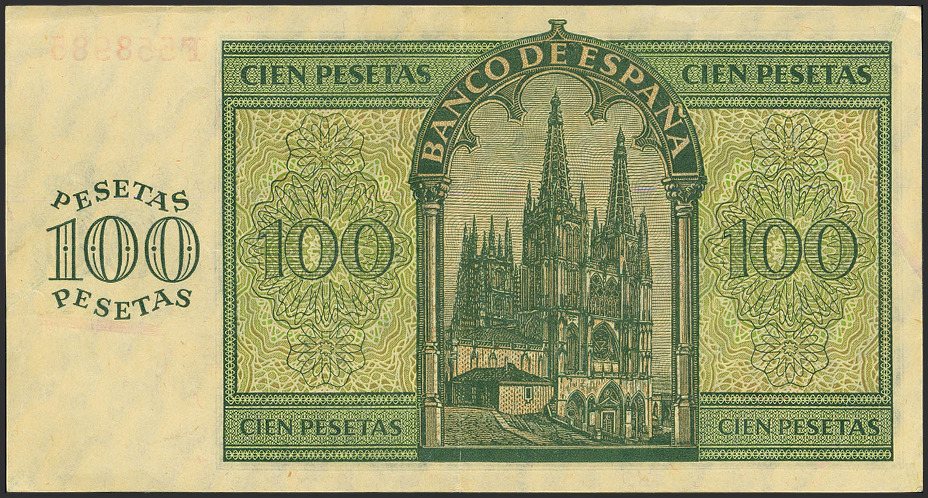 100 Pesetas. November 21, 1936. Series F. (Edifil 2023: 421a). Retains part of the original finish. EF-.
