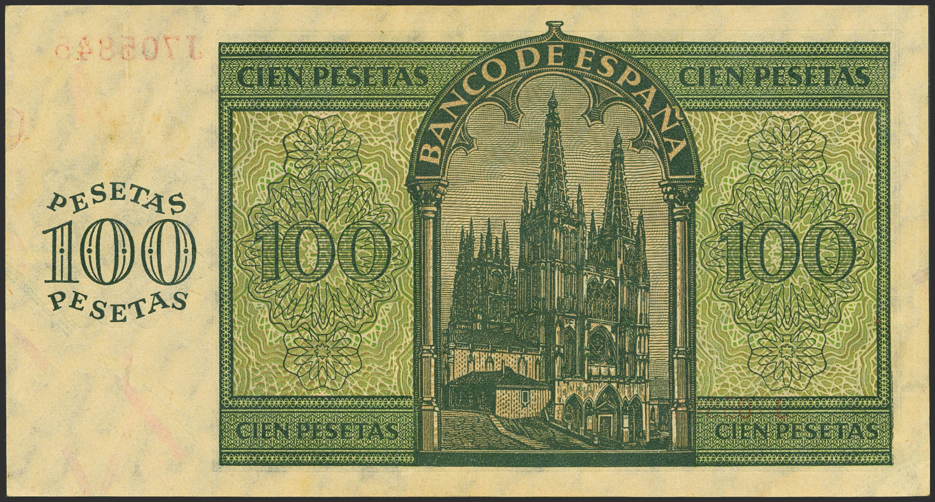 English 100 Pesetas. November 21, 1936. Series J. (Edifil 2023: 421a). Original condition. EF+++.