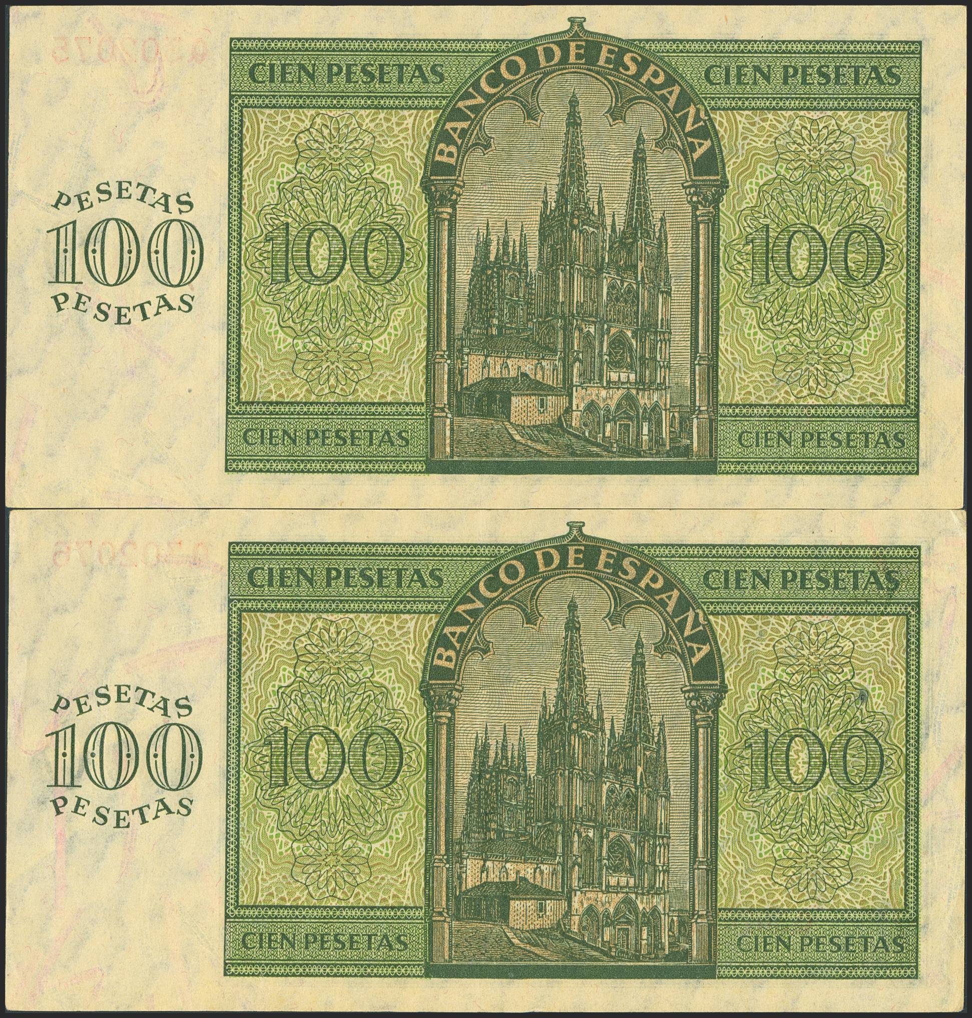 English 100 Pesetas. November 21, 1936. Consecutive pair. Series Q. (Edifil 2023: 421a). Retains much of its original finish. EF+.