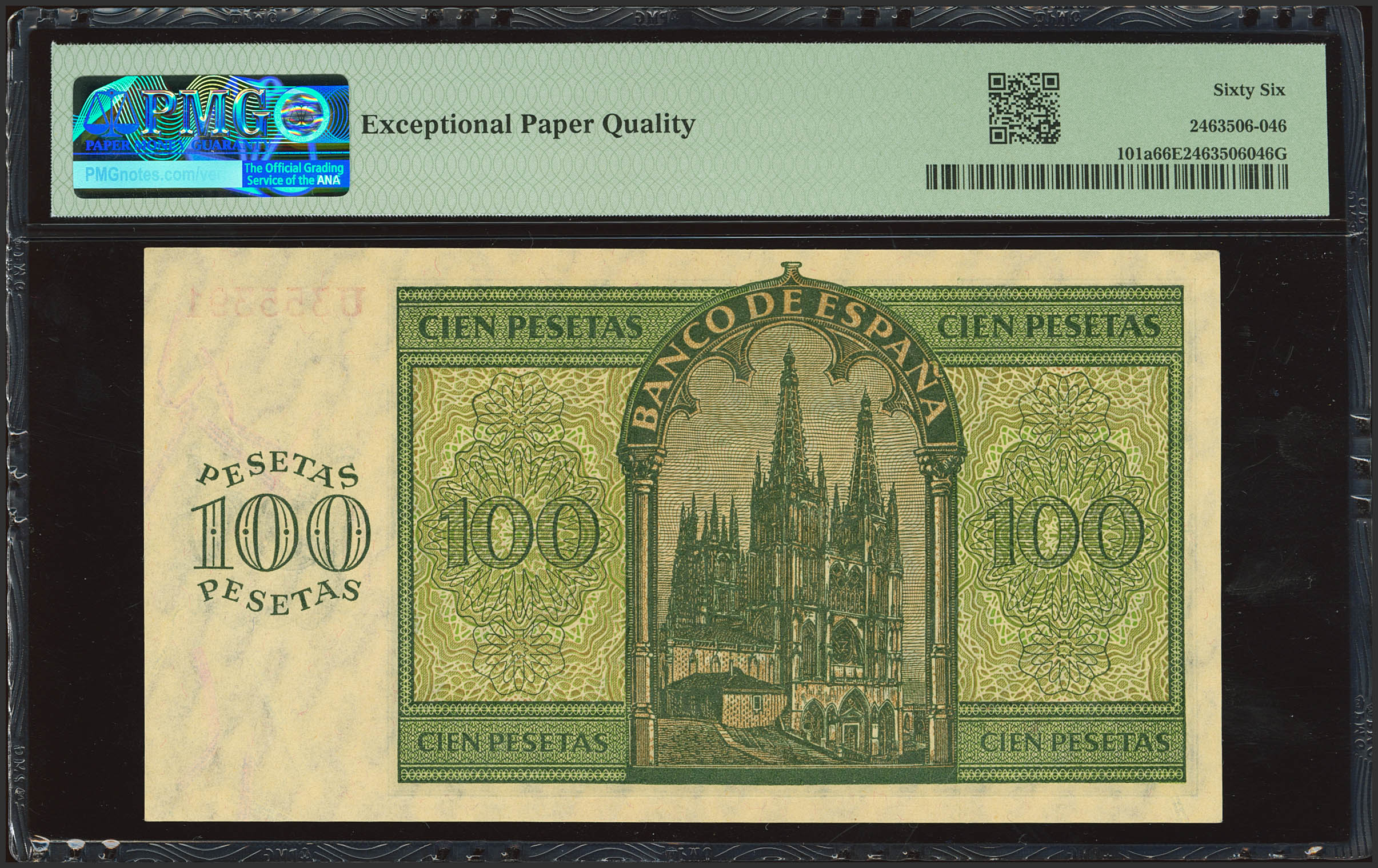100 Pesetas. November 21, 1936. Series U. (Edifil 2023: 421a, Pick: 101a). Very rare in this exceptional condition, original finish. Uncirculated. Encapsulated PMG66EPQ.