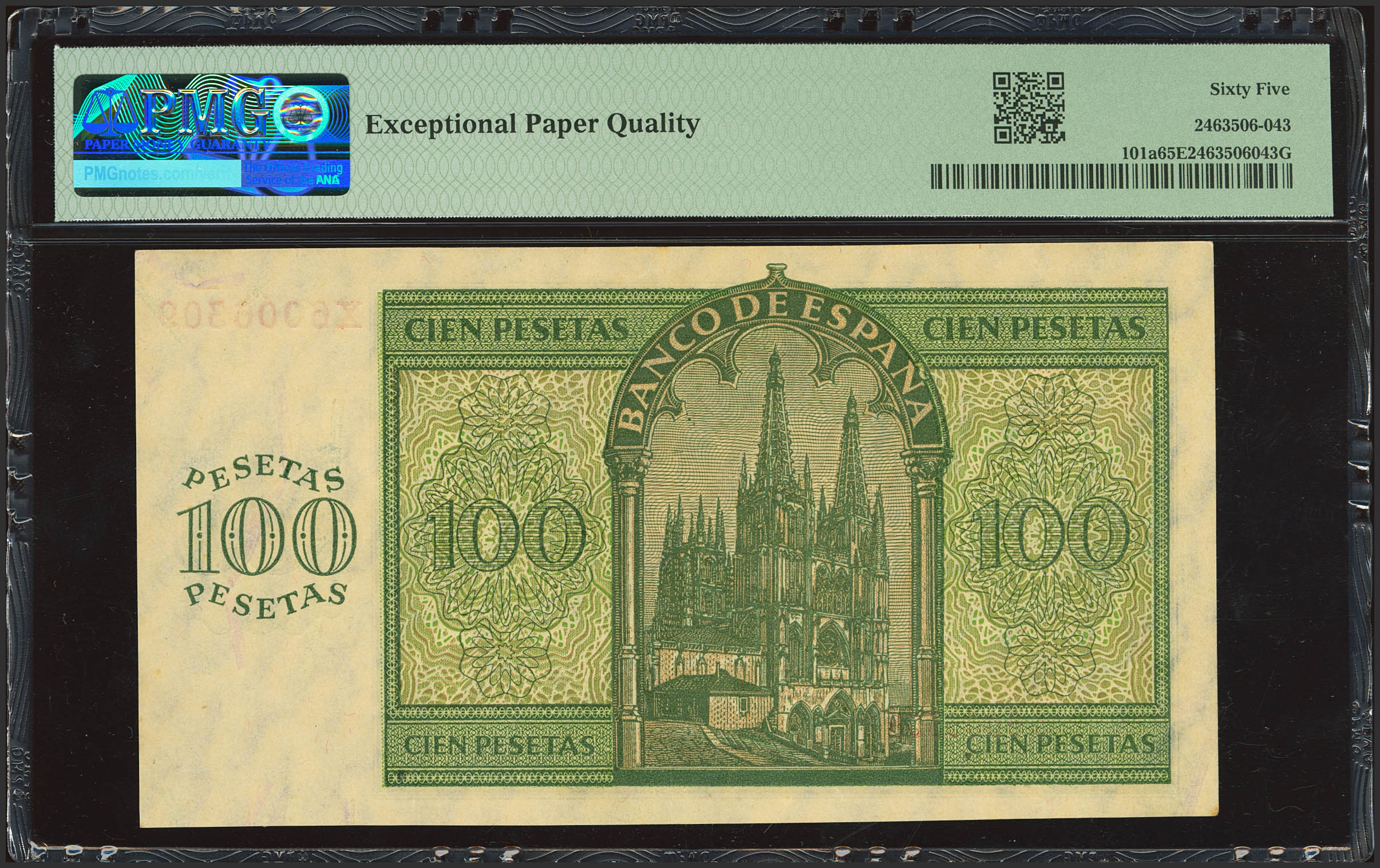 100 Pesetas. November 21, 1936. Series X, last series issued. (Edifil 2023: 421b, Pick: 101a). Rare in this exceptional condition, original finish. Uncirculated. PMG65EPQ capsule.