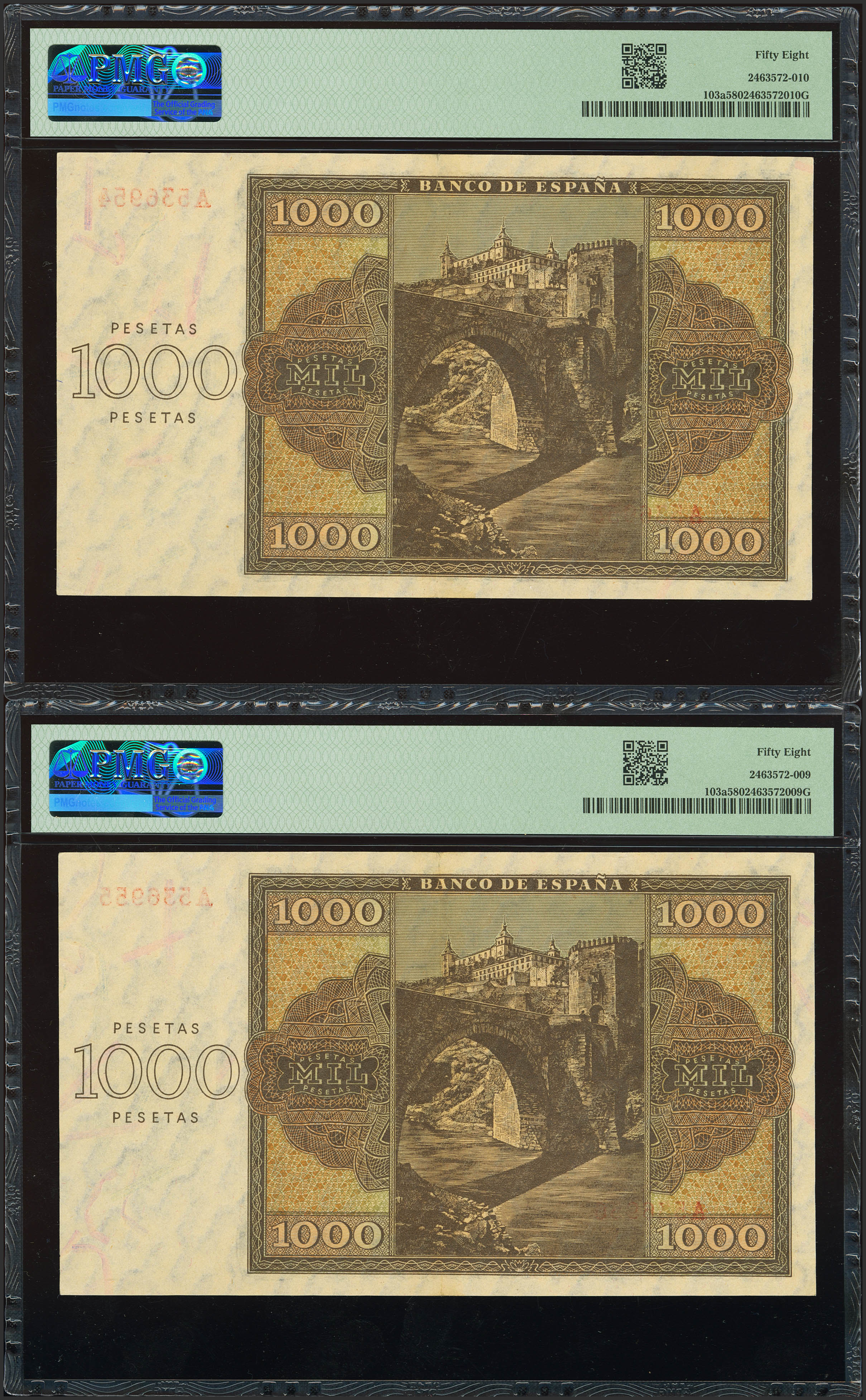 English 1000 Pesetas. November 21, 1936. Consecutive pair. Series A. (Edifil 2023: 423, Pick: 103a). Extraordinarily rare pair. EF++. Both PMG58 capsules.