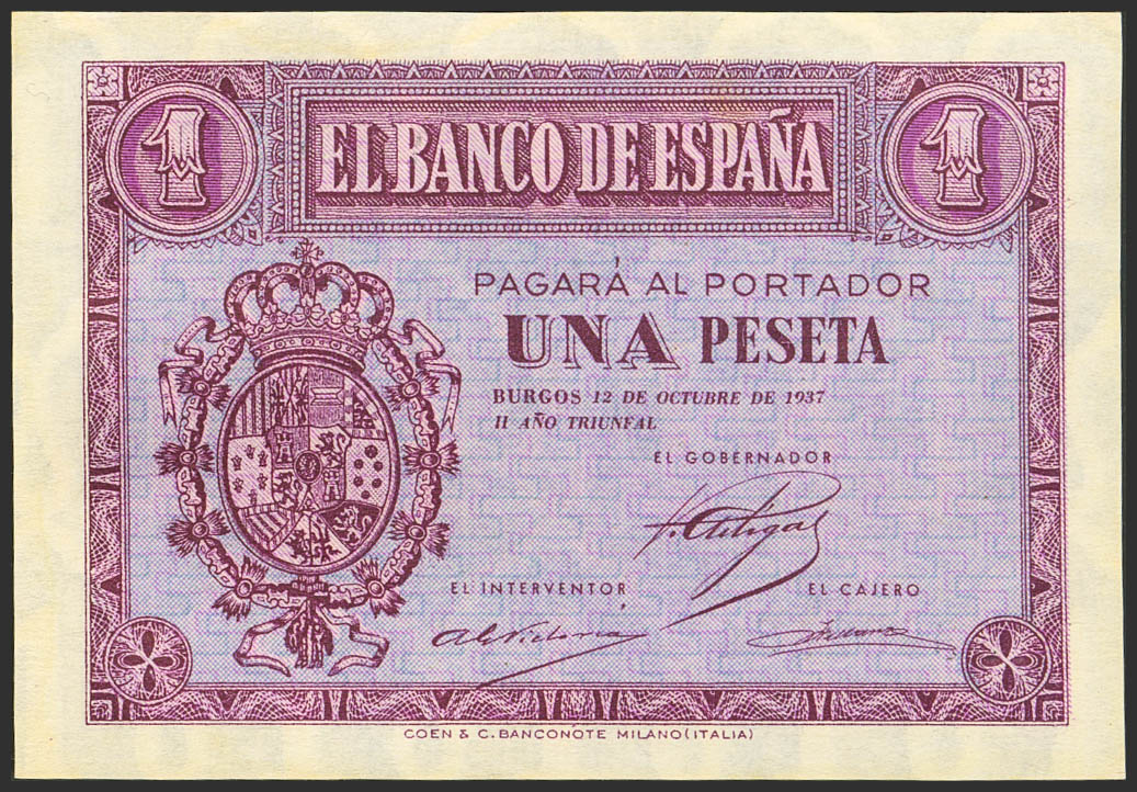 1 Peseta. October 12, 1937. Series A. (Edifil 2023: 425). Original condition. Uncirculated.