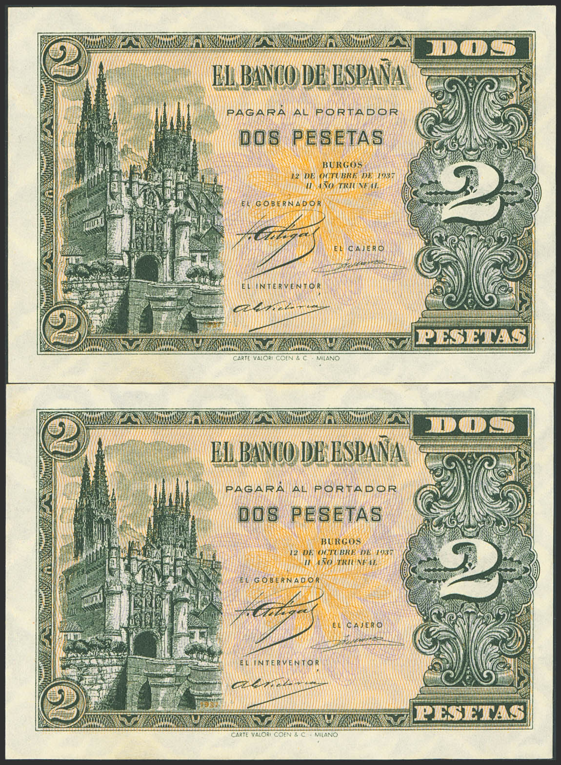 2 Pesetas. October 12, 1937. Consecutive pair. Series A. (Edifil 2023: 426). Extremely rare pair, especially in this condition, original finish. Uncirculated.