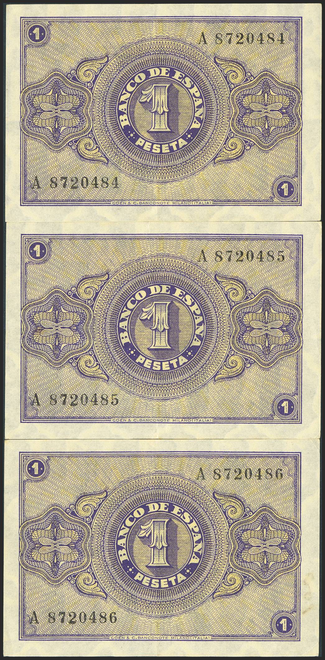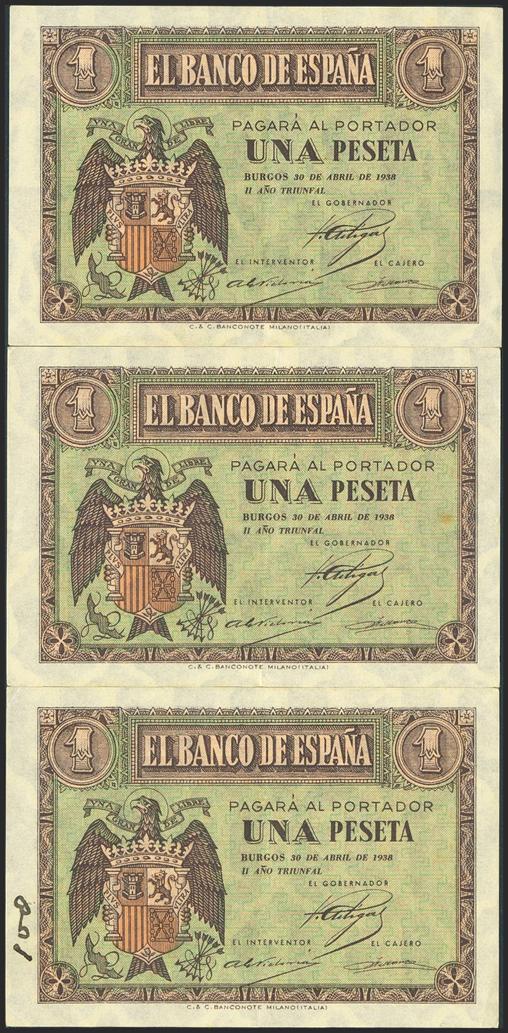 1 Peseta. April 30, 1938. Consecutive trio. Series A. (Edifil 2023: 428). They retain much of the original sizing, one of them with ink. Extremely Fine.