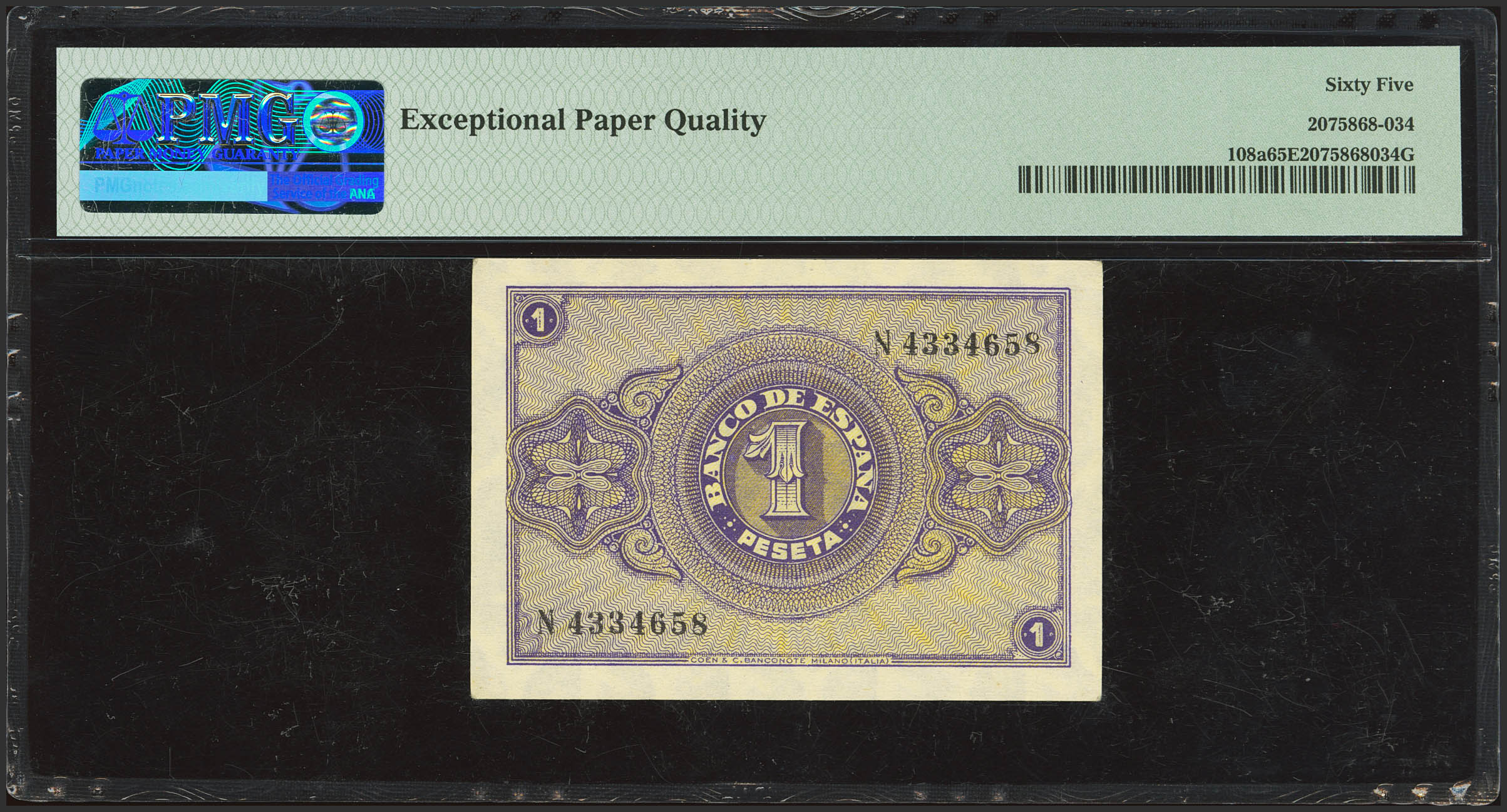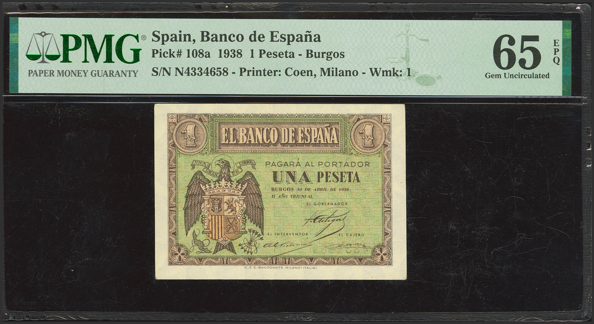 English 1 Peseta. April 30, 1938. Series N, last series issued. (Edifil 2023: 428b, Pick: 108a). Original finish. Uncirculated. PMG65EPQ capsule.