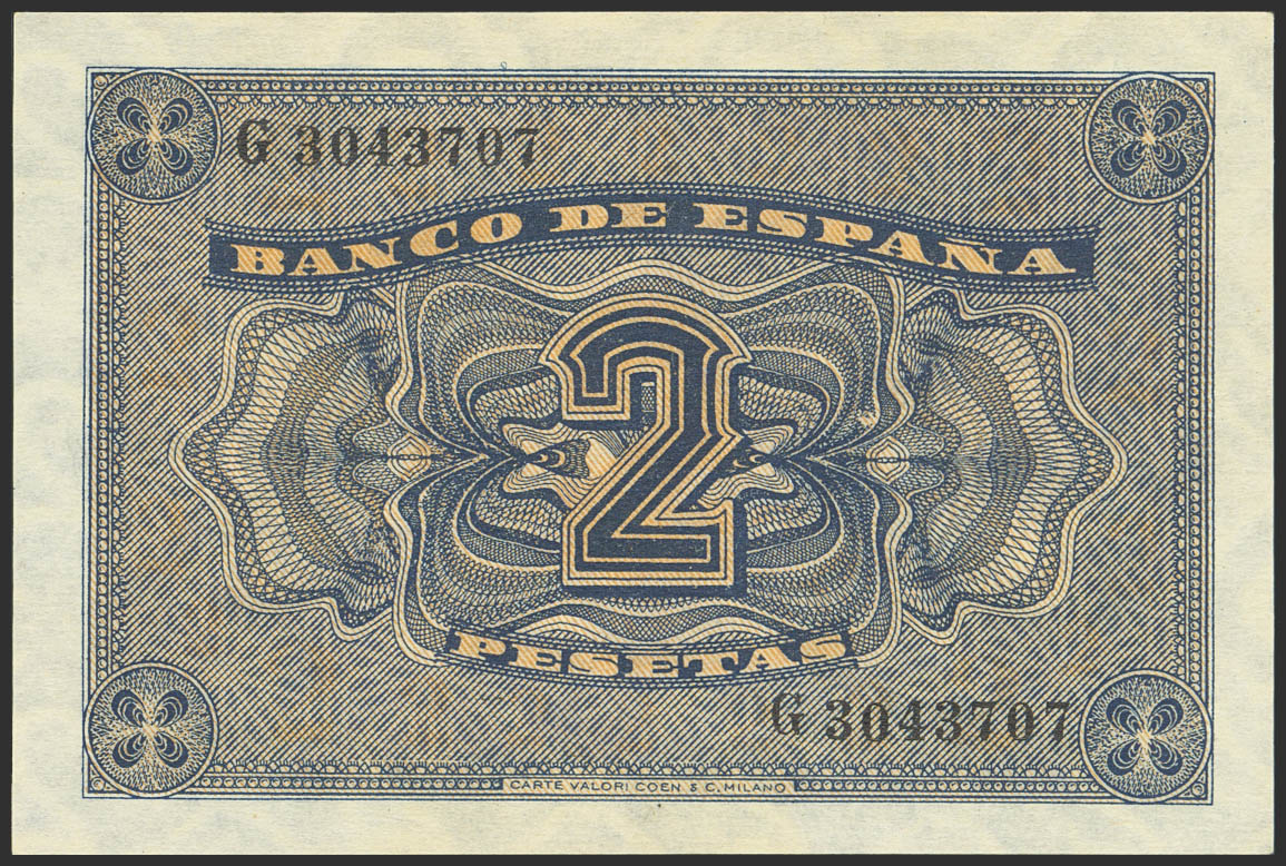 English 2 Pesetas. April 30, 1938. Series G. (Edifil 2023: 429a). Original finish. Uncirculated.