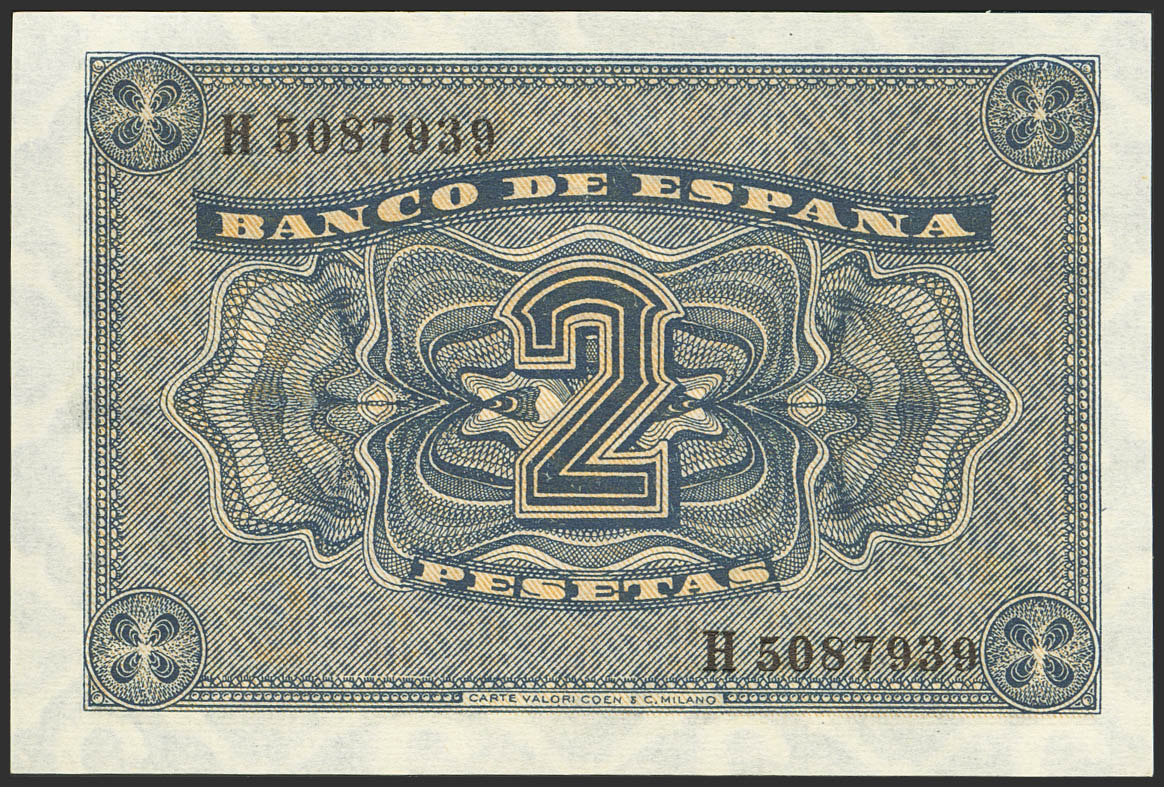 English 2 Pesetas. April 30, 1938. Series H. (Edifil 2023: 429a). Original finish. Uncirculated.
