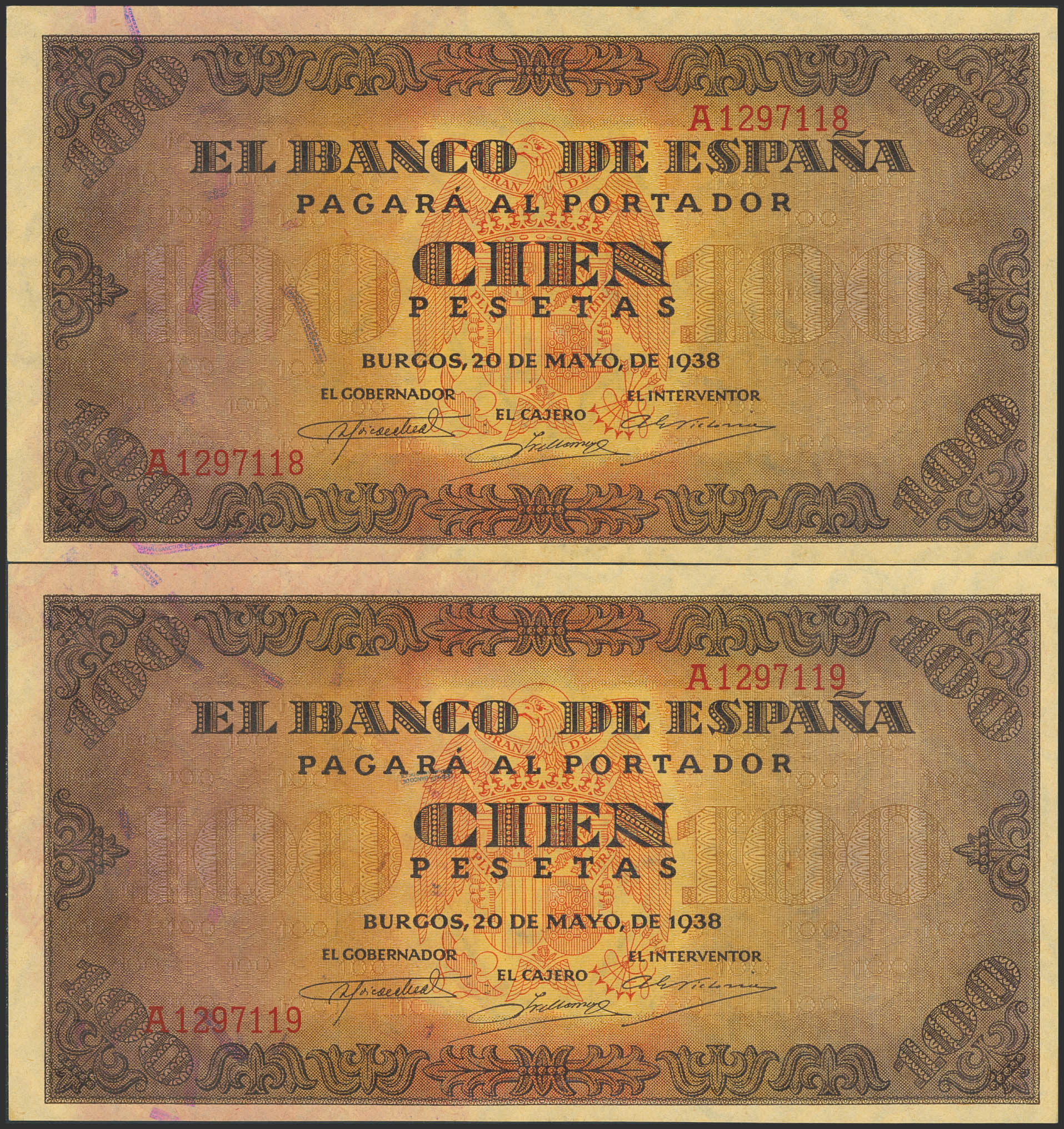 100 Pesetas. May 20, 1938. Consecutive pair. Series A. (Edifil 2023: 432). Original finish. Uncirculated.
