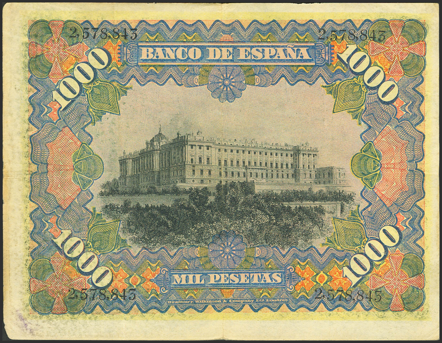 1000 Pesetas. July 15, 1907. No serial number. (Edifil 2023: 322). Unusual, especially without repairs. VF-.
